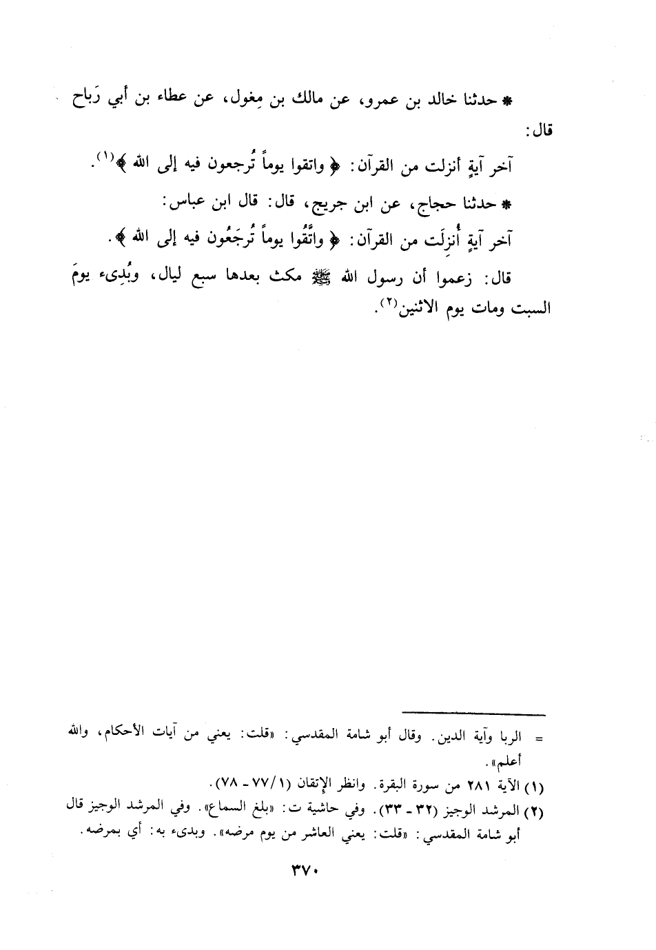 حَدَّثَنَا خَالِدُ بْنُ عَمْرٍو، عَنْ مَالِكِ بْنِ مِغْوَلٍ، عَنْ عَطَاءِ بْنِ أَبِي رَبَاحٍ، قَالَ: §آخِرُ أَيَّةٍ أُنْزِلَتْ مِنَ الْقُرْآنِ: {وَاتَّقُوا يَوْمًا تُرْجَعُونَ فِيهِ إِلَى اللَّهِ} [البقرة: 281]