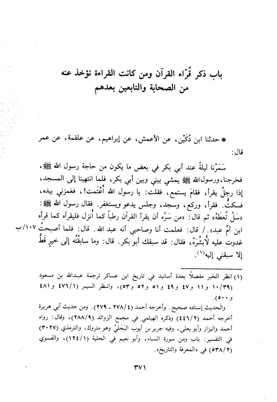 حَدَّثَنَا ابْنُ دُكَيْنٍ، عَنِ الْأَعْمَشِ، عَنْ إِبْرَاهِيمَ، عَنْ عَلْقَمَةَ، عَنْ عُمَرَ، قَالَ: سَمَرْنَا لَيْلَةً عِنْدَ أَبِي بَكْرٍ فِي بَعْضِ مَا يَكُونُ مِنْ حَاجَةِ رَسُولِ اللَّهِ صَلَّى اللَّهُ عَلَيْهِ وَسَلَّمَ، فَخَرَجْنَا، وَرَسُولُ اللَّهِ صَلَّى اللَّهُ عَلَيْهِ وَسَلَّمَ يَمْشِي بَيْنِي وَبَيْنَ أَبِي بَكْرٍ، فَلَمَّا انْتَهَيْنَا إِلَى الْمَسْجِدِ، إِذَا رَجُلٌ يَقْرَأُ، فَقَامَ يَسْتَمِعُ، فَقُلْتُ: يَا رَسُولَ اللَّهِ، أَعْتَمْتَ، فَغَمَزَنِي بِيَدِهِ، فَسَكَتُّ. فَقَرَأَ، وَرَكَعَ، وَسَجَدَ، وَجَلَسَ يَدْعُو وَيَسْتَغْفِرُ. فَقَالَ رَسُولُ اللَّهِ صَلَّى اللَّهُ عَلَيْهِ وَسَلَّمَ: «سَلْ تُعْطَهْ» ثُمَّ قَالَ: «§مَنْ سَرَّهُ أَنْ يَقْرَأَ الْقُرْآنَ رَطْبًا كَمَا أُنْزِلَ فَلْيَقْرَأْهُ كَمَا قَرَأَهُ ابْنُ أُمِّ عَبْدٍ» . قَالَ: فَعَلِمْتُ أَنَا وَصَاحِبِي أَنَّهُ عَبْدُ اللَّهِ. قَالَ: فَلَمَّا أَصْبَحْتُ غَدَوْتُ عَلَيْهِ لِأُبَشِّرَهُ، فَقَالَ: قَدْ سَبَقَكَ أَبُو بَكْرٍ. قَالَ: وَمَا سَابَقْتُهُ إِلَى خَيْرٍ قَطُّ إِلَّا سَبَقَنِي إِلَيْهِ -[372]- قَالَ أَبُو عُبَيْدٍ: حَدَّثَنَا عَفَّانُ، عَنْ عَبْدِ الْوَاحِدِ بْنِ زِيَادٍ، عَنِ الْحَسَنِ بْنِ عُبَيْدِ اللَّهِ النَّخَعِيِّ، عَنْ إِبْرَاهِيمَ، عَنْ عَلْقَمَةَ، عَنْ قَرْثَعٍ، عَنْ قَيْسٍ أَوِ ابْنِ قَيْسٍ رَجُلٍ مِنْ جُعْفِي , عَنْ عُمَرَ، عَنِ النَّبِي صَلَّى اللَّهُ عَلَيْهِ وَسَلَّمَ، مِثْلَ ذَلِكَ