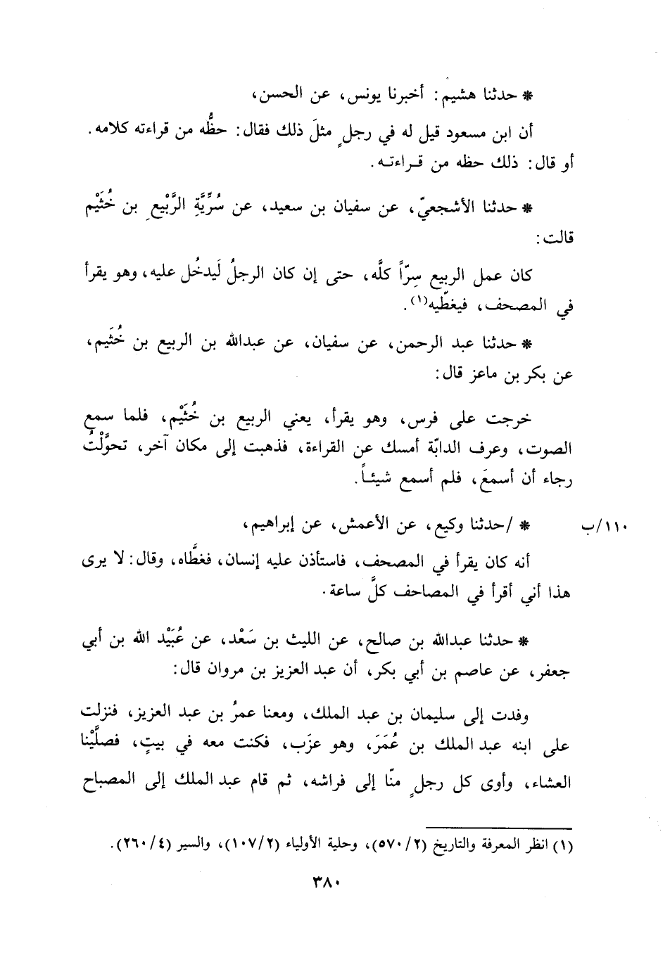 حَدَّثَنَا وَكِيعٌ، عَنِ الْأَعْمَشِ، عَنْ إِبْرَاهِيمَ، أَنَّهُ كَانَ يَقْرَأُ فِي الْمُصْحَفِ، فَاسْتَأْذَنَ عَلَيْهِ إِنْسَانٌ، فَغَطَّاهُ، وَقَالَ: §لَا يَرَى هَذَا أَنِّي أَقْرَأُ فِي الْمَصَاحِفِ كُلَّ سَاعَةٍ