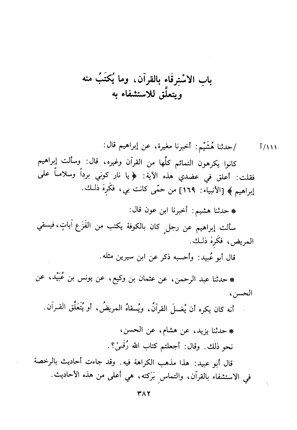 حَدَّثَنَا عَبْدُ الرَّحْمَنِ، عَنْ عُثْمَانَ بْنِ وَكِيعٍ، عَنْ يُونُسَ بْنِ عُبَيْدِ، عَنِ الْحَسَنِ، أَنَّهُ §كَانَ يَكْرَهُ أَنْ يُغْسَلَ الْقُرْآنُ، وَيُسْقَاهُ الْمَرِيضُ، أَوْ يُتَعَلَّقَ الْقُرْآنُ حَدَّثَنَا يَزِيدُ، عَنْ هِشَامٍ، عَنِ الْحَسَنِ، نَحْوَ ذَلِكَ. وَقَالَ: أَجَعَلْتُمْ كِتَابَ اللَّهِ رُقًى؟ قَالَ أَبُو عُبَيْدٍ: هَذَا مَذْهَبُ الْكَرَاهَةِ فِيهِ. وَقَدْ جَاءَتْ أَحَادِيثُ بِالرُّخْصَةِ فِي الِاسْتِشْفَاءِ بِالْقُرْآنِ، وَالْتِمَاسِ بَرَكَتِهِ، هِيَ أَعْلَى مِنْ هَذِهِ الْأَحَادِيثِ