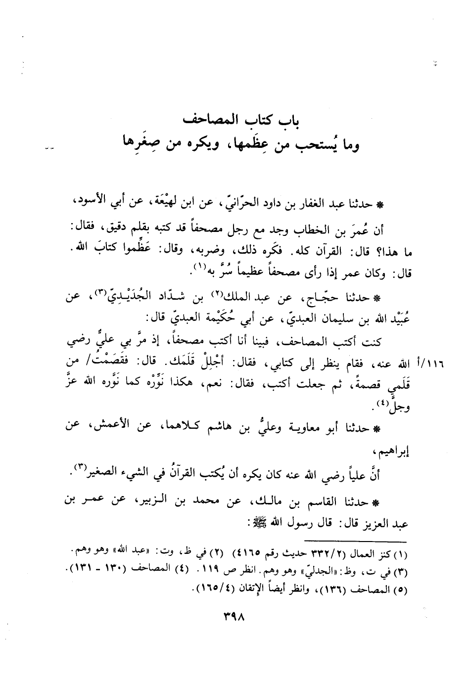 حَدَّثَنَا عَبْدُ الْغَفَّارِ بْنُ دَاوُدَ الْحَرَّانِيُّ، عَنِ ابْنِ لَهِيعَةَ، عَنْ أَبِي الْأَسْوَدِ، أَنَّ عُمَرَ بْنَ الْخَطَّابِ، وَجَدَ مَعَ رَجُلٍ مُصْحَفًا قَدْ كَتَبَهُ بِقَلَمٍ دَقِيقٍ، فَقَالَ: مَا هَذَا؟ قَالَ: الْقُرْآنُ كُلُّهُ فَكَرِهَ ذَلِكَ، وَضَرَبَهُ، وَقَالَ: §عَظِّمُوا كِتَابَ اللَّهِ. قَالَ: وَكَانَ عُمَرُ إِذَا رَأَى مُصْحَفًا عَظِيمًا سُرَّ بِهِ