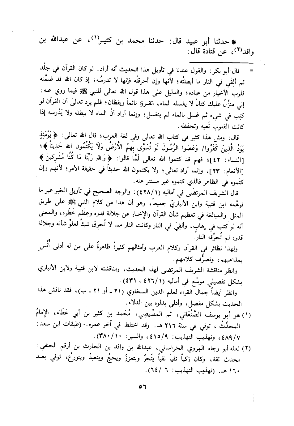 حَدَّثَنَا أَبُو عُبَيْدٍ قَالَ حَدَّثَنَا مُحَمَّدُ بْنُ كَثِيرٍ، عَنْ عَبْدِ اللَّهِ بْنِ وَاقِدٍ، عَنْ قَتَادَةَ، قَالَ: -[57]- «§مَا جَالَسَ أَحَدٌ الْقُرْآنَ إِلَّا فَارَقَهُ بِزِيَادَةٍ أَوْ نُقْصَانٍ» . قَالَ: ثُمَّ قَرَأَ: {وَنُنَزِّلُ مِنَ الْقُرْآنِ مَا هُوَ شِفَاءٌ وَرَحْمَةٌ لِلْمُؤْمِنِينَ وَلَا يَزِيدُ الظَّالِمِينَ إِلَّا خَسَارًا} [الإسراء: 82]