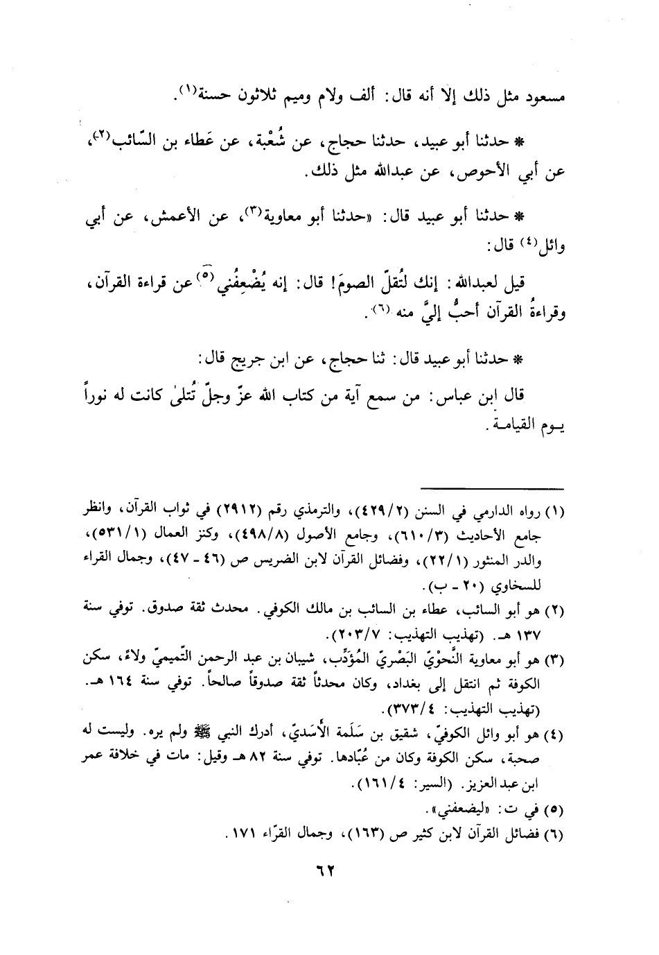 حَدَّثَنَا أَبُو عُبَيْدٍ قَالَ حَدَّثَنَا أَبُو مُعَاوِيَةَ، عَنِ الْأَعْمَشِ، عَنْ أَبِي وَائِلٍ، قَالَ: قِيلَ لِعَبْدِ اللَّهِ: إِنَّكَ لَتُقِلُّ الصَّوْمَ؟ قَالَ: «إِنَّهُ §يُضْعِفُنِي عَنْ قِرَاءَةِ الْقُرْآنِ، وَقِرَاءَةُ الْقُرْآنِ أَحَبُّ إِلَيَّ مِنْهُ»