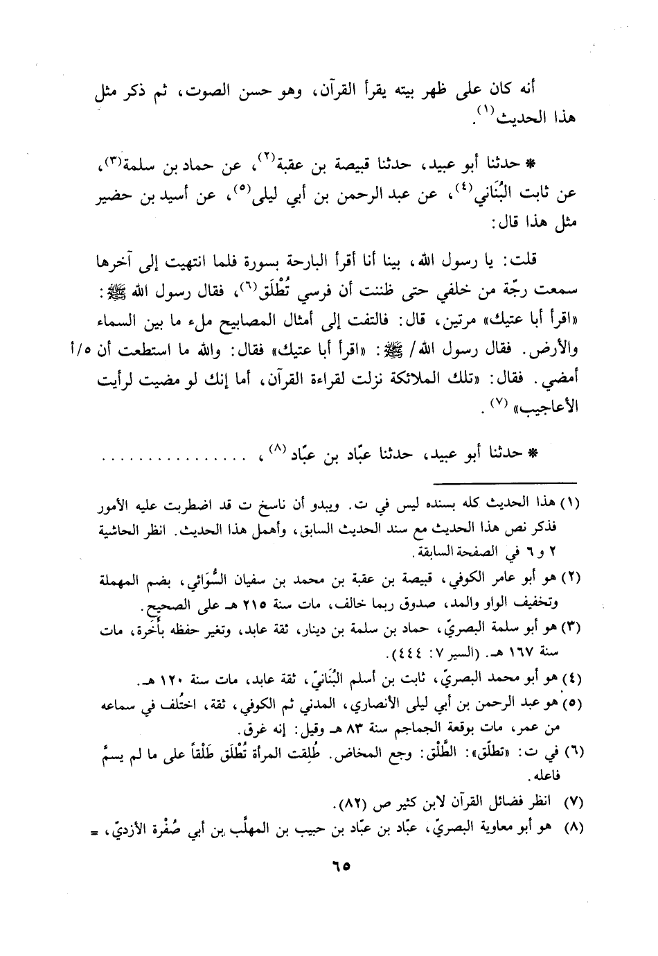 حَدَّثَنَا أَبُو عُبَيْدٍ حَدَّثَنَا عَبَّادُ بْنُ عَبَّادٍ، -[66]- عَنْ جَرِيرِ بْنِ حَازِمٍ، عَنْ عَمِّهِ جَرِيرِ بْنِ زَيْدٍ أَنَّ أَشْيَاخَ أَهْلِ الْمَدِينَةِ حَدَّثُوهُ أَنَّ رَسُولَ اللَّهِ صَلَّى اللَّهُ عَلَيْهِ وَسَلَّمَ قِيلَ لَهُ: أَلَمْ تَرَ ثَابِتَ بْنَ قَيْسِ بْنِ شَمَّاسٍ لَمْ تَزَلْ دَارُهُ الْبَارِحَةَ تُزْهِرُ مَصَابِيحَ؟ قَالَ: «§فَلَعَلَّهُ قَرَأَ بِسُورَةِ الْبَقَرَةِ» . قَالَ: فَسُئِلَ ثَابِتٌ , فَقَالَ: قَرَأْتُ سُورَةَ الْبَقَرَةِ