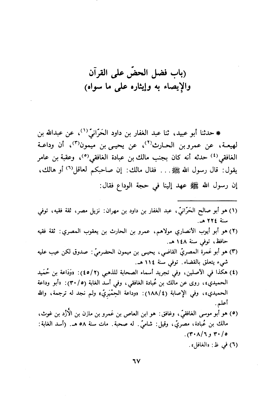 حَدَّثَنَا أَبُو عُبَيْدٍ ثنا عَبْدُ الْغَفَّارِ بْنُ دَاوُدَ الْحَرَّانِيُّ، عَنْ عَبْدِ اللَّهِ بْنِ لَهِيعَةَ، عَنْ عَمْرِو بْنِ الْحَارِثِ، عَنْ يَحْيَى بْنِ مَيْمُونٍ، أَنَّ وَدَاعَةَ الْغَافِقِيَّ، حَدَّثَهُ أَنَّهُ، كَانَ بِجَنْبِ مَالِكِ بْنِ عُبَادَةَ الْغَافِقِيِّ، وَعُقْبَةُ بْنُ عَامِرٍ يَقُولُ: قَالَ رَسُولُ اللَّهِ صَلَّى اللَّهُ عَلَيْهِ وَسَلَّمَ. . . فَقَالَ مَالِكٌ: إِنَّ صَاحِبَكُمْ لَعَاقِلٌ أَوْ هَالِكٌ، إِنَّ رَسُولَ اللَّهِ صَلَّى اللَّهُ عَلَيْهِ وَسَلَّمَ عَهِدَ إِلَيْنَا فِي حَجَّةِ الْوَدَاعِ فَقَالَ: -[68]- «§عَلَيْكُمْ بِالْقُرْآنِ فَإِنَّكُمْ سَتَرْجِعُونِ إِلَى قَوْمٍ يَشْتَهُونَ الْحَدِيثَ عَنِّي، فَمَنْ عَقَلَ شَيْئًا فَلْيُحَدِّثْ بِهِ، وَمَنْ قَالَ عَلَيَّ مَا لَمْ أَقُلْ فَلْيَتَبَوَّأْ بَيْتًا أَوْ قَالَ مَقْعَدًا مِنْ جَهَنَّمَ» . قَالَ: لَا أَدْرِي أَيَّهُمَا قَالَ
