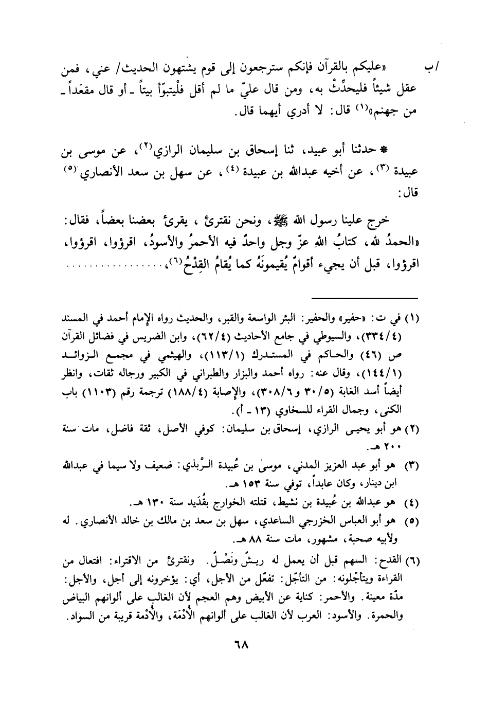 حَدَّثَنَا أَبُو عُبَيْدٍ ثنا إِسْحَاقُ بْنُ سُلَيْمَانَ الرَّازِيُّ، عَنْ مُوسَى بْنِ عُبَيْدَةَ، عَنْ أَخِيهِ عَبْدِ اللَّهِ بْنِ عُبَيْدَةَ، عَنْ سَهْلِ بْنِ سَعْدٍ الْأَنْصَارِيِّ، قَالَ: خَرَجَ عَلَيْنَا رَسُولُ اللَّهِ صَلَّى اللَّهُ عَلَيْهِ وَسَلَّمَ، وَنَحْنُ نَقْتَرِئُ، يُقْرِئُ بَعْضُنَا بَعْضًا، فَقَالَ: «الْحَمْدُ لِلَّهِ، §كِتَابُ اللَّهِ عَزَّ وَجَلَّ وَاحِدٌ فِيهِ الْأَحْمَرَ وَالْأَسْوَدَ، اقْرَءُوا، اقْرَءُوا، اقْرَءُوا، قَبْلَ أَنْ يَجِيءَ أَقْوَامٌ يُقِيمُونَهُ كَمَا يُقَامُ الْقَدَحُ، -[69]- لَا يُجَاوِزُ تَرَاقِيَهُمْ، يَتَعَجَّلُونَ أَجْرَهُ وَلَا يَتَأَجَّلُونَهُ» . حَدَّثَنَا أَبُو عُبَيْدٍ وَحَدَّثَنَا حَجَّاجٌ، عَنِ ابْنِ لَهِيعَةَ، عَنْ بَكْرِ بْنِ سَوَادَةَ، عَنْ وَفَاءٍ الْحَضْرَمِيِّ، عَنْ سَهْلِ بْنِ سَعْدٍ، عَنِ النَّبِيِّ صَلَّى اللَّهُ عَلَيْهِ وَسَلَّمَ مِثْلَ ذَلِكَ أَوْ نَحْوَهُ. حَدَّثَنَا أَبُو عُبَيْدٍ قَالَ حَدَّثَنَا حَجَّاجٌ، عَنِ ابْنِ لَهِيعَةَ، عَنْ بَكْرِ بْنِ سَوَادَةَ، عَنْ أَبِي حَمْزَةَ الْخَوْلَانِيِّ، أَحْسَبُهُ عَنْ أَنَسِ بْنِ مَالِكٍ، عَنِ النَّبِيِّ صَلَّى اللَّهُ عَلَيْهِ وَسَلَّمَ مِثْلَ ذَلِكَ