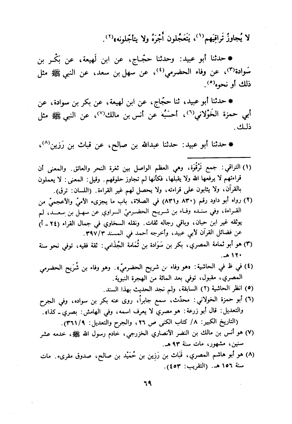 حَدَّثَنَا أَبُو عُبَيْدٍ، حَدَّثَنَا عَبْدُ اللَّهِ بْنُ صَالِحٍ، عَنْ قَبَاثِ بْنِ رَزِينٍ، -[70]- عَنْ عَلِيِّ بْنِ رَبَاحٍ اللَّخْمِيِّ، عَنْ عُقْبَةَ بْنِ عَامِرٍ، قَالَ: خَرَجَ عَلَيْنَا رَسُولُ اللَّهِ صَلَّى اللَّهُ عَلَيْهِ وَسَلَّمَ يَوْمًا، وَنَحْنُ فِي الْمَسْجِدِ، نَتَدَارَسُ الْقُرْآنَ، فَقَالَ: «§تَعَلَّمُوا كِتَابَ اللَّهِ عَزَّ وَجَلَّ وَاقْتَنُوهُ» . قَالَ: وَحَسَبْتُ أَنَّهُ قَالَ: «وَاغْنُوا بِهِ، فَوَالَّذِي نَفْسِي بِيَدِهِ لَهُوَ أَشَدُّ تَفَلُّتًا مِنَ الْمَخَاضِ مِنَ الْعُقُلِ» حَدَّثَنَا أَبُو عُبَيْدٍ حَدَّثَنَا عَبْدُ اللَّهِ بْنُ صَالِحٍ، عَنْ مُوسَى بْنِ عَلِيِّ بْنِ رَبَاحٍ، عَنْ أَبِيهِ، عَنْ عُقْبَةَ بْنِ عَامِرٍ، عَنِ النَّبِيِّ صَلَّى اللَّهُ عَلَيْهِ وَسَلَّمَ مِثْلَ ذَلِكَ، إِلَّا أَنَّهُ قَالَ: «وَاقْتَنُوهُ وَتَغَنَّوْا بِهِ» ، وَلَمْ يَشُكَّ فِيهِ