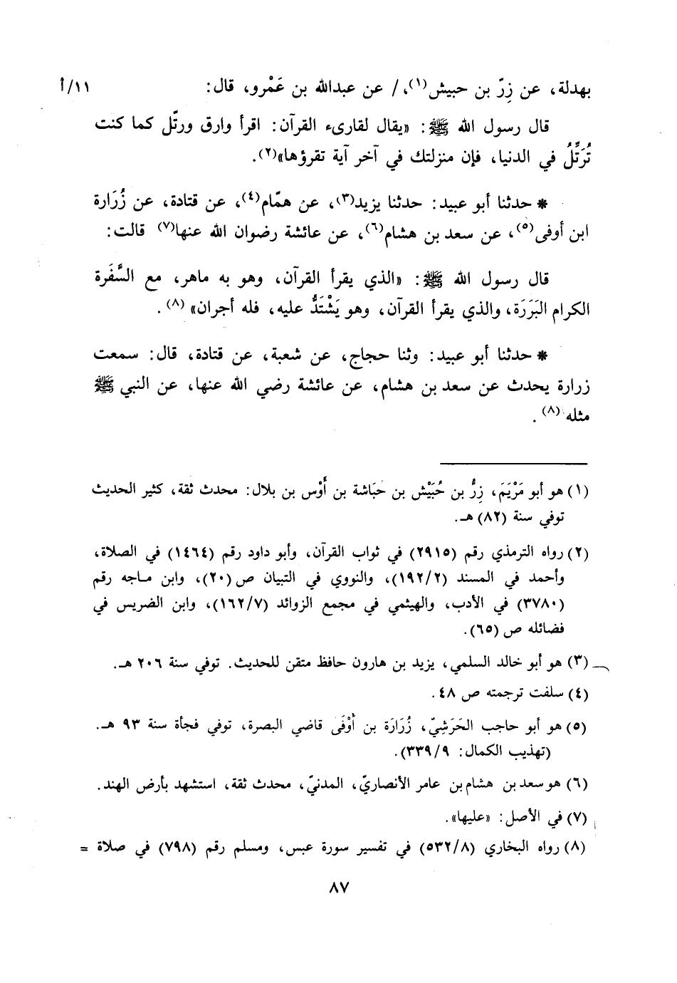 حَدَّثَنَا أَبُو عُبَيْدٍ حَدَّثَنَا يَزِيدُ، عَنْ هَمَّامٍ، عَنْ قَتَادَةَ، عَنْ زُرَارَةَ بْنِ أَوْفَى، عَنْ سَعْدِ بْنِ هِشَامٍ، عَنْ عَائِشَةَ، رِضْوَانُ اللَّهِ عَنْهَا قَالَتْ: قَالَ رَسُولُ اللَّهِ صَلَّى اللَّهُ عَلَيْهِ وَسَلَّمَ: «§الَّذِي يَقْرَأُ الْقُرْآنَ، وَهُوَ بِهِ مَاهِرٌ، مَعَ السَّفَرَةِ الْكِرَامِ الْبَرَرَةِ، وَالَّذِي يَقْرَأُ الْقُرْآنَ، وَهُوَ يَشْتَدُّ عَلَيْهِ، فَلَهُ أَجْرَانِ» حَدَّثَنَا أَبُو عُبَيْدٍ وثنا حَجَّاجٌ، عَنْ شُعْبَةَ، عَنْ قَتَادَةَ، قَالَ: سَمِعْتُ زُرَارَةَ، يُحَدِّثُ عَنْ سَعْدِ بْنِ هِشَامٍ، عَنْ عَائِشَةَ، رَضِيَ اللَّهُ عَنْهَا، عَنِ النَّبِيِّ صَلَّى اللَّهُ عَلَيْهِ وَسَلَّمَ مِثْلَهُ