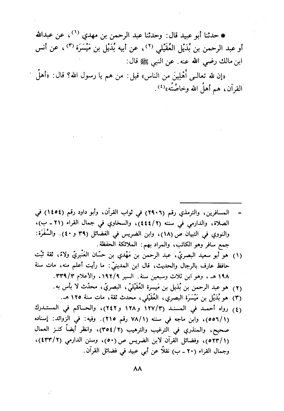 حَدَّثَنَا أَبُو عُبَيْدٍ قَالَ وَحَدَّثَنَا عَبْدُ الرَّحْمَنِ بْنُ مَهْدِيٍّ، عَنْ عَبْدِ اللَّهِ، أَوْ عَبْدِ الرَّحْمَنِ بْنِ بُدَيْلٍ الْعُقَيْلِيِّ، عَنْ أَبِيهِ بُدَيْلِ بْنِ مَيْسَرَةَ، عَنْ أَنَسِ بْنِ مَالِكٍ، رَضِيَ اللَّهُ عَنْهُ عَنِ النَّبِيِّ صَلَّى اللَّهُ عَلَيْهِ وَسَلَّمَ قَالَ: «إِنَّ لِلَّهِ تَعَالَى §أَهْلِينَ مِنَ النَّاسِ» قِيلَ: مَنْ هُمْ يَا رَسُولَ اللَّهِ؟ قَالَ: «أَهْلُ الْقُرْآنِ، هُمْ أَهْلُ اللَّهِ وَخَاصَّتُهُ»