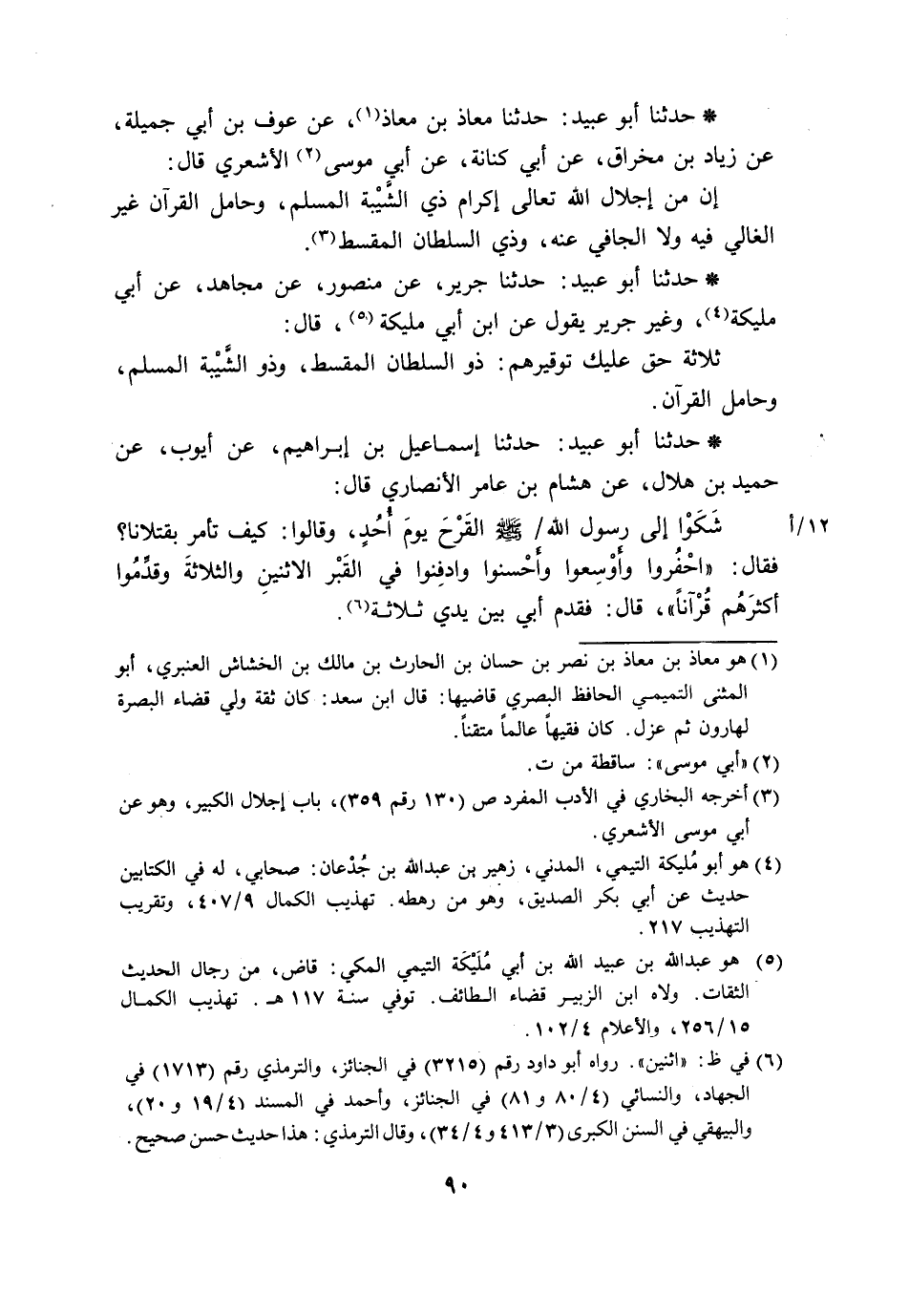 حَدَّثَنَا أَبُو عُبَيْدٍ حَدَّثَنَا مُعَاذُ بْنُ مُعَاذٍ، عَنْ عَوْفِ بْنِ أَبِي جَمِيلَةَ، عَنْ زِيَادِ بْنِ مِخْرَاقٍ، عَنْ أَبِي كِنَانَةَ، عَنْ أَبِي مُوسَى الْأَشْعَرِيِّ، قَالَ: «§إِنَّ مِنْ إِجْلَالِ اللَّهِ تَعَالَى إِكْرَامَ ذِي الشَّيْبَةِ الْمُسْلِمِ، وَحَامِلِ الْقُرْآنِ غَيْرِ الْغَالِي فِيهِ وَلَا الْجَافِي عَنْهُ، وَذِي السُّلْطَانِ الْمُقْسِطِ»