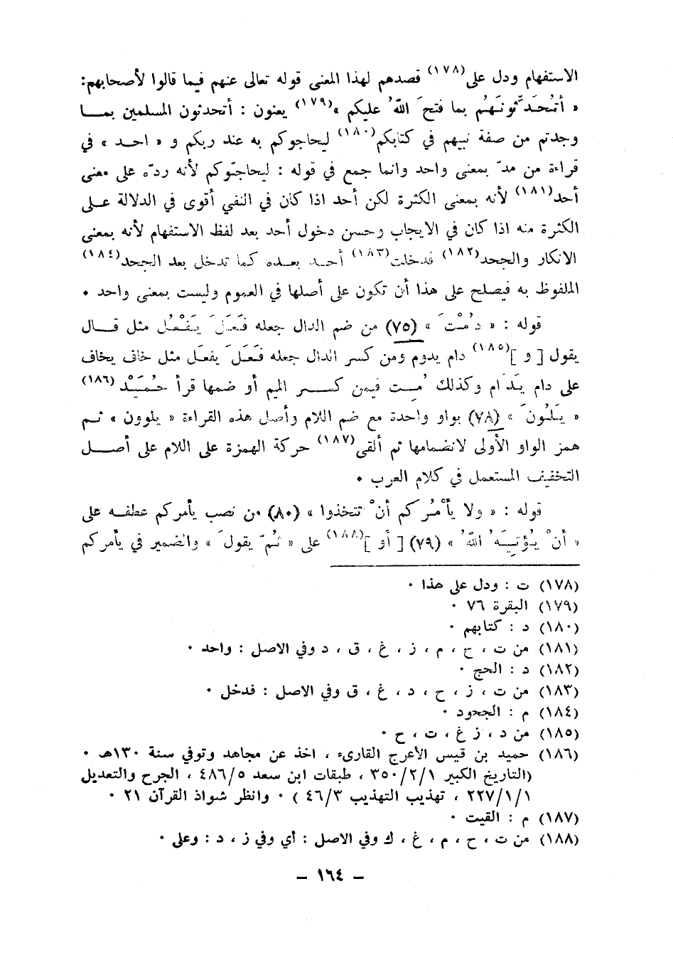 الِاسْتِفْهَام وَدلّ على قصدهم لهَذَا الْمَعْنى قَوْله تَعَالَى عَنْهُم فِيمَا قَالُوا لأصحابهم أتحدثونهم بِمَا فتح الله عَلَيْكُم يعنون أتحدثون الْمُسلمين بِمَا وجدْتُم من صفة نَبِيّهم فِي كتابكُمْ ليحاجوكم بِهِ عِنْد ربكُم وَاحِد فِي قِرَاءَة من مد بِمَعْنى وَاحِد وَإِنَّمَا جمع فِي قَوْله ليحاجوكم لِأَنَّهُ رده على معنى أحد لِأَنَّهُ بِمَعْنى الْكَثْرَة لَكِن أحد إِذا كَانَ فِي النَّفْي أقوى فِي الدّلَالَة على الْكَثْرَة مِنْهُ إِذا كَانَ فِي الْإِيجَاب وَحسن دُخُول أحد بعد لفظ الِاسْتِفْهَام لِأَنَّهُ بِمَعْنى الْإِنْكَار والجحد فَدخلت أحد بعده كَمَا تدخل بعد الْجحْد الملفوظ بِهِ فيصلح على هَذَا أَن تكون على أَصْلهَا فِي الْعُمُوم وَلَيْسَت بِمَعْنى وَاحِد