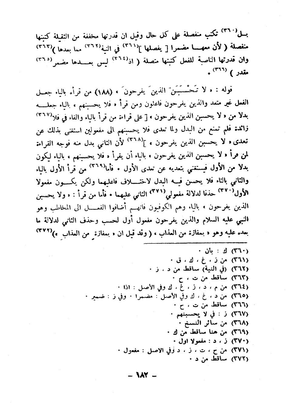 قَوْله {لَا تحسبن الَّذين يفرحون} من قَرَأَهُ بِالْيَاءِ جعل الْفِعْل غير مُتَعَدٍّ وَالَّذين يفرحون فاعلون وَمن قَرَأَ فَلَا يحسبنهم بِالْيَاءِ جعله بَدَلا من لَا يَحسبن الَّذين يفرحون على قِرَاءَة من قَرَأَ بِالْيَاءِ وَالْفَاء فِي فَلَا زَائِدَة فَلم تمنع من الْبَدَل وَلما تعدى فَلَا يحسبنهم إِلَى مفعولين اسْتغنى بذلك عَن تعدى وَلَا يَحسبن الَّذين يفرحون لِأَن الثَّانِي بدل مِنْهُ فَوجه الْقِرَاءَة لمن قَرَأَ لَا يَحسبن الَّذين يفرحون بِالْيَاءِ أَن يقْرَأ فَلَا يحسبنهم بِالْيَاءِ ليَكُون بَدَلا من الأول فيستغني بتعديه عَن تعدى الأول فَأَما من قَرَأَ الأول بِالْيَاءِ وَالثَّانِي بِالتَّاءِ فَلَا يحسن فِيهِ الْبَدَل لاخْتِلَاف فاعليهما وَلكم يكون مَفْعُولا الأول حذفا لدلَالَة مفعولي الثَّانِي عَلَيْهِمَا فَأَما من قَرَأَ وَلَا يَحسبن الَّذين يفرحون بِالْيَاءِ وهم الْكُوفِيُّونَ فَإِنَّهُم أضافوا الْفِعْل إِلَى الْمُخَاطب وَهُوَ النَّبِي عَلَيْهِ السَّلَام وَالَّذين يفرحون مفعول أول لحسب وَحذف الثَّانِي لدلَالَة مَا بعده عَلَيْهِ وَهُوَ بمفازة من الْعَذَاب وَقد قيل أَن بمفازة من الْعَذَاب