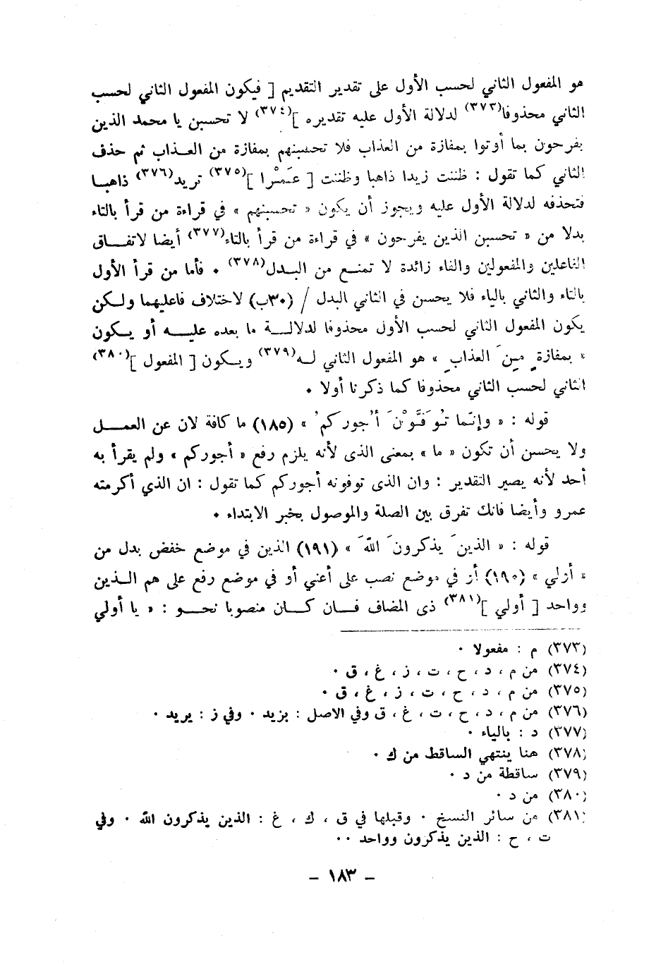 هُوَ الْمَفْعُول الثَّانِي لحسب الأول على تَقْدِير التَّقْدِيم فَيكون الْمَفْعُول الثَّانِي لحسب الثَّانِي محذوفا لدلَالَة الأول عَلَيْهِ تَقْدِيره لَا تحسبن يَا مُحَمَّد الَّذين يفرحون بِمَا أُوتُوا بمفازة من الْعَذَاب فَلَا تحسبنهم بمفازة من الْعَذَاب ثمَّ حذف الثَّانِي كَمَا تَقول ظَنَنْت زيدا ذَاهِبًا وظننت عمرا تُرِيدُ 2 ذَاهِبًا فتحذفه لدلَالَة الأول عَلَيْهِ وَيجوز أَن يكون تحسبنهم فِي قِرَاءَة من قَرَأَ بِالتَّاءِ بَدَلا من تحسبن الَّذين يفرحون فِي قِرَاءَة من قَرَأَ بِالتَّاءِ أَيْضا لِاتِّفَاق الفاعلين والمفعولين وَالْفَاء زَائِدَة لَا تمنع من الْبَدَل فَأَما من قَرَأَ الأول بِالتَّاءِ وَالثَّانِي بِالْيَاءِ فَلَا يحسن فِي الثَّانِي الْبَدَل لاخْتِلَاف فاعليهما وَلَكِن يكون الْمَفْعُول الثَّانِي لحسب الأول محذوفا لدلَالَة مَا بعده عَلَيْهِ أَو يكون بمفازة من الْعَذَاب هُوَ الْمَفْعُول الثَّانِي لَهُ وَيكون الْمَفْعُول الثَّانِي لحسب الثَّانِي محذوفا كَمَا ذكرنَا أَولا