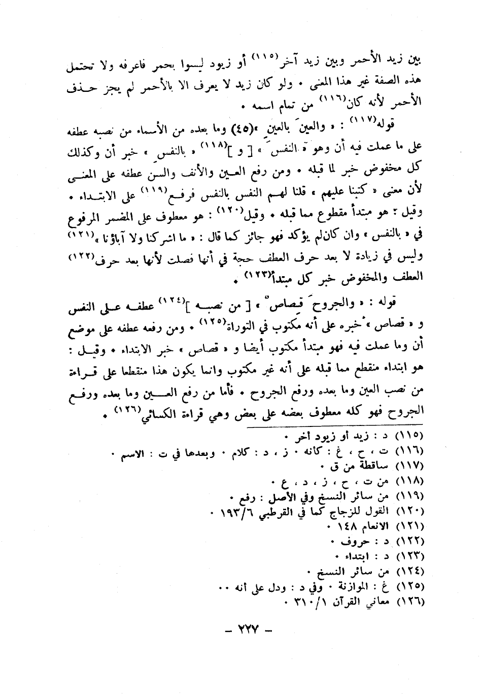قَوْله {والجروح قصاص} من نَصبه عطفه على النَّفس وقصاص خَبره على أَنه مَكْتُوب فِي التَّوْرَاة وَمن رَفعه عطفه على مَوضِع أَن وَمَا عملت فِيهِ فَهُوَ مُبْتَدأ مَكْتُوب أَيْضا وقصاص خبر الِابْتِدَاء وَقيل هُوَ ابْتِدَاء مُنْقَطع مِمَّا قبله على أَنه غير مَكْتُوب وَإِنَّمَا بِكَوْن هَذَا مُنْقَطِعًا على قِرَاءَة من نصب الْعين وَمَا بعده وَرفع الجروح فَأَما من رفع الْعين وَمَا بعده وَرفع الجروح فَهُوَ كُله مَعْطُوف بعضه على بعض وَهِي قِرَاءَة الْكسَائي