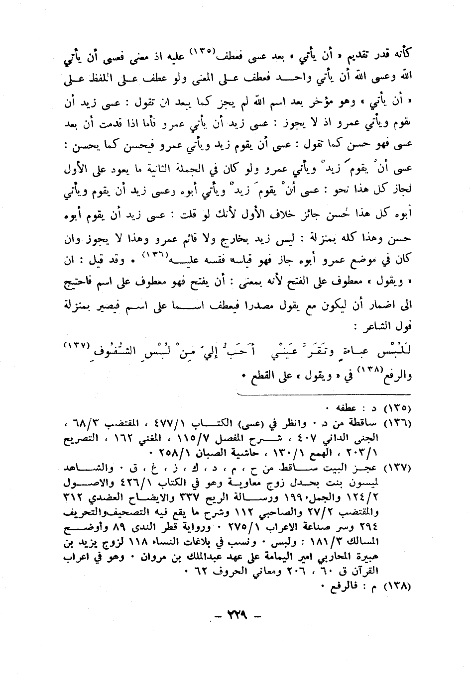 كَأَنَّهُ قدر قديم أَن يَأْتِي بعد عَسى فعطف عَلَيْهِ إِذْ معنى فَعَسَى أَن يَأْتِي الله وَعَسَى الله أَن يَأْتِي وَاحِد فعطف على الْمَعْنى وَلَو عطف على اللَّفْظ على أَن يَأْتِي وَهُوَ مُؤخر بعد اسْم الله لم يجز كَمَا يبعد أَن تَقول عَسى زيد أَن يقوم وَيَأْتِي عَمْرو إِذْ لَا يجوز عَسى زيد أَن يَأْتِي عَمْرو فَأَما إِذا قدمت أَن بعد عَسى فَهُوَ حسن كَمَا تَقول عَسى أَن يقوم زيد وَيَأْتِي عَمْرو فَيحسن كَمَا يحسن عَسى أَن يقوم زيد وَيَأْتِي عَمْرو وَلَو كَانَ فِي الْجُمْلَة الثَّانِيَة مَا يعود على الأول لجَاز كل هَذَا نَحْو عَسى أَن يقوم زيد وَيَأْتِي أَبوهُ وَعَسَى زيد أَن يقوم وَيَأْتِي أَبوهُ كل هَذَا حسن جَائِز خلاف الأول لِأَنَّك لَو قلت عَسى زيد أَن يقوم أَبوهُ حسن وَهَذَا كُله بِمَنْزِلَة لَيْسَ زيد بِخَارِج وَلَا قَائِم عَمْرو وَهَذَا لَا يجوز وان كَانَ فِي مَوضِع عَمْرو أَبوهُ جَازَ فَهُوَ قِيَاسه فقسه عَلَيْهِ وَقد قيل أَن وَيَقُول مَعْطُوف على الْفَتْح لِأَنَّهُ بِمَعْنى أَن يفتح فَهُوَ مَعْطُوف على اسْم فاحتيج إِلَى إِضْمَار أَن ليَكُون مَعَ يَقُول مصدرا فيعطف اسْما على اسْم فَيصير بِمَنْزِلَة قَول الشَّاعِر ... للبس عباءة وتقر عَيْني ... أحب إِلَيّ من لبس الشفوف ...
