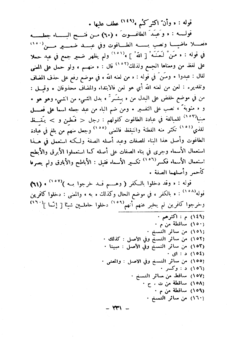 قَوْله {وَعبد الطاغوت} من فتح الْبَاء جعله فعلا مَاضِيا وَنصب بِهِ الطاغوت وَفِي عبد ضمير من فِي قَوْله من لَعنه الله وَلم يظْهر ضمير جمع فِي عبد حملا على لفظ من وَمَعْنَاهُ الْجمع وَلذَلِك قَالَ مِنْهُم وَلَو حمل على الْمَعْنى لقَالَ عبدُوا وَمن فِي قَوْله من لَعنه الله فِي مَوضِع رفع على حذف الْمُضَاف وَتَقْدِيره لعن من لَعنه الله أَي هُوَ لعن فالابتداء والمضاف محذوفان وَقيل من فِي مَوضِع خفض على الْبَدَل بشر بدل الشَّيْء من الشَّيْء وَهُوَ هُوَ ومثوبة نصب على التَّفْسِير وَمن ضم الْبَاء من عبد جعله اسْما على فعل مَبْنِيا للْمُبَالَغَة فِي عبَادَة الطاغوت كَقَوْلِهِم رجل فطن ويقظ للَّذي تكْثر مِنْهُ الفطنة والتيقظ فَالْمَعْنى وَجعل مِنْهُم من بلغ فِي عبَادَة الطاغوت وأصل هَذَا الْبناء للصفات وَعبد أَصله الصّفة وَلكنه اسْتعْمل فِي هَذَا اسْتِعْمَال الْأَسْمَاء وَجرى فِي بِنَاء الصِّفَات على أَصله كَمَا استعملوا الأبرق والأبطح اسْتِعْمَال الْأَسْمَاء فَكسر تكسير الْأَسْمَاء فَقيل الأباطح والأبارق وَلم يصرفا كأحمر وأصلهما الصّفة