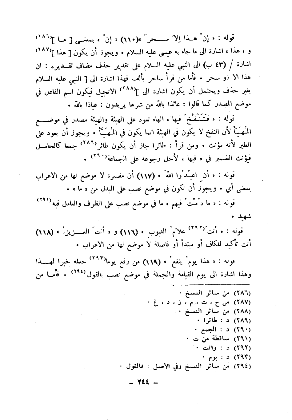 قَوْله {فتنفخ فِيهَا} الْهَاء تعود على الْهَيْئَة والهيئة مصدر فِي مَوضِع المهيأ لِأَن النفخ لَا يكون فِي الْهَيْئَة إِنَّمَا يكون فِي المهيأ وَيجوز أَن يعود على الطير لِأَنَّهُ مؤنث وَمن قَرَأَ طائرا جَازَ أَن يكون طَائِر جمعا كالحامل فيؤنث الضَّمِير فِي فِيهَا لأجل رُجُوعه على الْجَمَاعَة