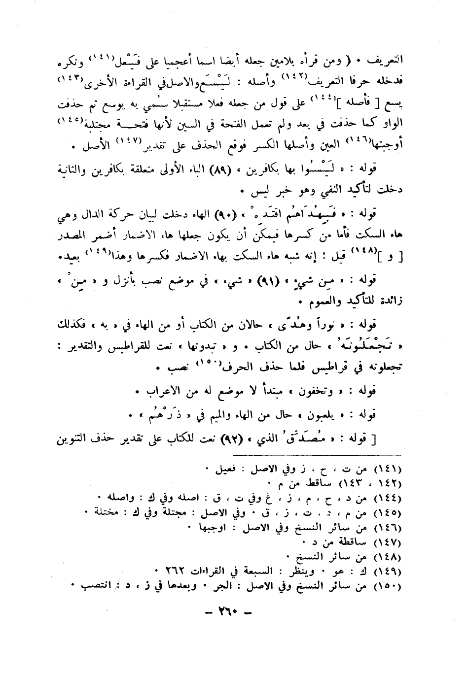 قَوْله {نورا وَهدى} حالان من الْكتاب أَو من الْهَاء فِي بِهِ فَكَذَلِك تجعلونه حَال من الْكتاب وتبدونها نعت للقراطيس وَالتَّقْدِير تجعلونه فِي قَرَاطِيس فَلَمَّا حذف الْحَرْف نصب