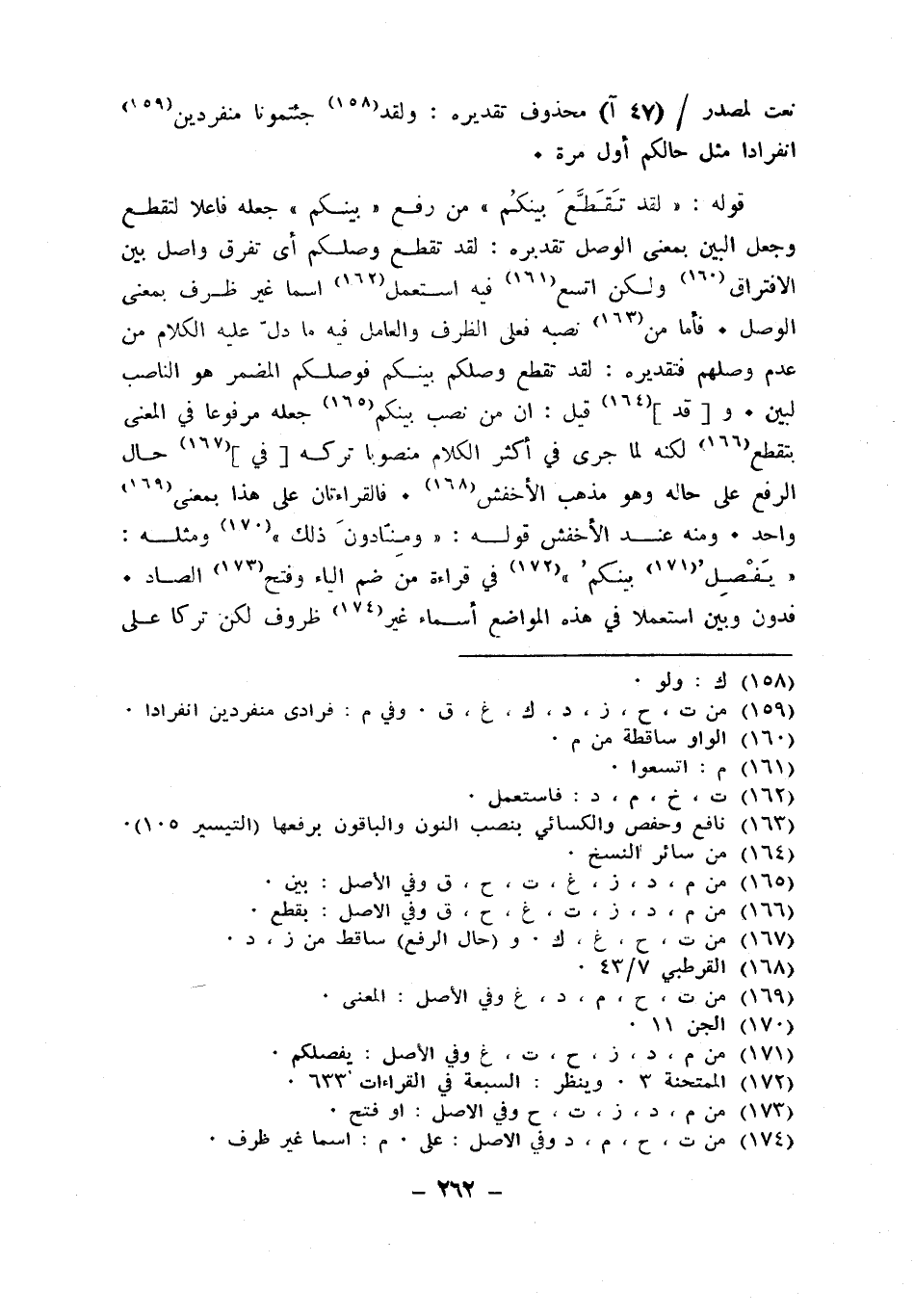 قَوْله {لقد تقطع بَيْنكُم} من رفع بَيْنكُم جعله فَاعِلا لتقطع وَجعل الْبَين بِمَعْنى الْوَصْل تَقْدِيره لقد تقطع وصلكم أَي تفرق وَاصل بَين الِافْتِرَاق وَلَكِن اتَّسع فِيهِ اسْتعْمل اسْما غير ظرف بِمَعْنى الْوَصْل فَأَما من نَصبه فعلى الظّرْف وَالْعَامِل فِيهِ مَا دلّ عَلَيْهِ الْكَلَام من عدم وصلهم فتقديره لقد تقطع وصلكم بَيْنكُم فوصلكم الْمُضمر هُوَ الناصب لبين وَقد قيل إِن من نصب بَيْنكُم جعله مَرْفُوعا فِي الْمَعْنى بتقطع لكنه لما جرى فِي أَكثر الْكَلَام مَنْصُوبًا تَركه فِي حَال الرّفْع على حَاله وَهُوَ مَذْهَب الْأَخْفَش فالقراءتان على هَذَا بِمَعْنى وَاحِد وَمِنْه عِنْد الْأَخْفَش قَوْله ومنادون ذَلِك وَمثله يفصل بَيْنكُم فِي قِرَاءَة من ضم الْيَاء وَفتح الصَّاد فدون وَبَين استعملا فِي هَذِه الْمَوَاضِع أَسمَاء غير ظروف لَكِن تركا على
