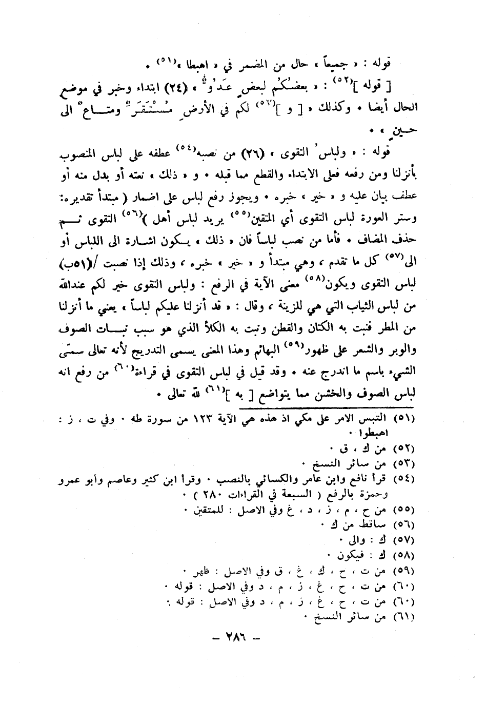 قَوْله {ولباس التَّقْوَى} من نَصبه عطفه على لِبَاس الْمَنْصُوب بأنزلنا وَمن رَفعه فعلى الِابْتِدَاء وَالْقطع مِمَّا قبله وَذَلِكَ نَعته أَو بدل مِنْهُ أَو عطف بَيَان عَلَيْهِ وَخير خَبره وَيجوز رفع لِبَاس على إِضْمَار مُبْتَدأ تَقْدِيره وَستر الْعَوْرَة لِبَاس التَّقْوَى أَي الْمُتَّقِينَ يُرِيد لِبَاس أهل التَّقْوَى ثمَّ حذف الْمُضَاف فَأَما من نصب لباسا فَإِن ذَلِك يكون إِشَارَة إِلَى اللبَاس أَو إِلَى كل مَا تقدم وَهِي مُبْتَدأ وَخير خَبره وَذَلِكَ إِذا نصبت لِبَاس التَّقْوَى وَيكون معنى الْآيَة فِي الرّفْع ولباس التَّقْوَى خير لكم عِنْد الله من لِبَاس الثِّيَاب الَّتِي هِيَ للزِّينَة وَقَالَ قد أنزلنَا عَلَيْكُم لباسا يَعْنِي مَا أنزلنَا من الْمَطَر فنبت بِهِ الْكَتَّان والقطن وَنبت بِهِ الْكلأ الَّذِي هُوَ سَبَب نَبَات الصُّوف والوبر وَالشعر على ظُهُور الْبَهَائِم وَهَذَا الْمَعْنى يُسمى التدريج لِأَنَّهُ تَعَالَى سمى الشَّيْء باسم مَا أندرج عَنهُ وَقد قيل فِي لِبَاس التَّقْوَى فِي قِرَاءَة من رفع انه لِبَاس الصُّوف والخشن مِمَّا يتواضع بِهِ لله تَعَالَى