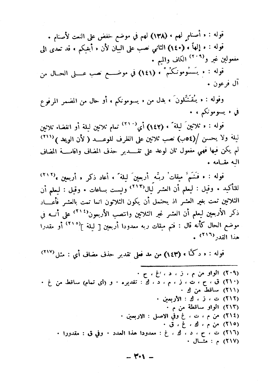 قَوْله {فتم مِيقَات ربه أَرْبَعِينَ لَيْلَة} أعَاد ذكر أَرْبَعِينَ للتَّأْكِيد وَقيل ليعلم أَن الْعشْر لَيَال وَلَيْسَت بساعات وَقيل ليعلم أَن الثَّلَاثِينَ تمت بِغَيْر الْعشْر إِذْ يحْتَمل أَن يكون الثَّلَاثُونَ إِنَّمَا تمت بالعشر فَأَعَادَ ذكر الْأَرْبَعين ليعلم أَن الْعشْر غير الثَّلَاثِينَ وانتصب الْأَرْبَعُونَ على أَنه فِي مَوضِع الْحَال كَأَنَّهُ قَالَ فتم مِيقَات ربه معدودا أَرْبَعِينَ لَيْلَة أَو مُقَدرا هَذَا الْقدر