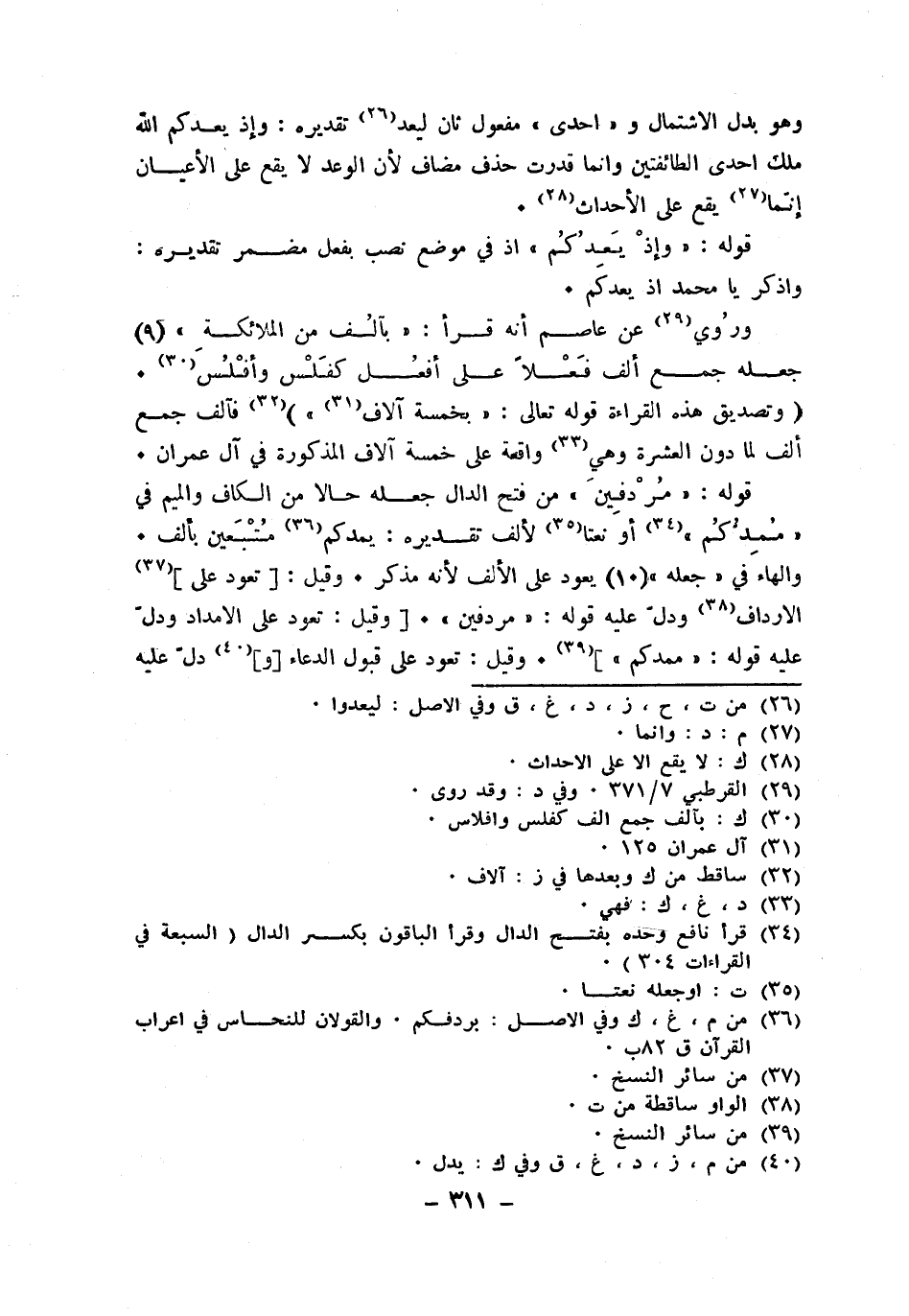 وَرُوِيَ عَن عَاصِم أَنه قَرَأَ {بِأَلف من الْمَلَائِكَة} جعله جمع ألف فعلا على أفعل كفلس وأفلس وتصديق هَذِه الْقِرَاءَة قَوْله تَعَالَى بِخَمْسَة آلَاف فآلف جمع ألف لما دون الْعشْرَة وَهِي وَاقعَة على خَمْسَة آلَاف الْمَذْكُورَة فِي آل عمرَان
