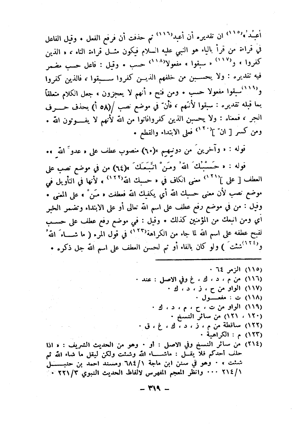 أعبد ان تَقْدِيره أَن أعبد ثمَّ حذفت أَن فَرفع الْفِعْل وَقيل الْفَاعِل فِي قِرَاءَة من قرا بِالْيَاءِ هُوَ النَّبِي عَلَيْهِ السَّلَام فَيكون مثل قِرَاءَة التَّاء الَّذين كفرُوا وسبقوا مَفْعُولا حسب وَقيل فَاعل حسب مُضْمر فِيهِ تَقْدِيره وَلَا يَحسبن من خَلفهم الَّذين كفرُوا سبقوا فَالَّذِينَ كفرُوا وسبقوا مَفْعُولا حسب وَمن فتح أَنهم لَا يعجزون جعل الْكَلَام مُتَعَلقا بِمَا قبله تَقْدِيره سبقوا لأَنهم فَأن فِي مَوضِع نصب بِحَذْف حرف الْجَرّ فَمَعْنَاه وَلَا يَحسبن الَّذين كفرُوا فاتوا من الله لأَنهم لَا يفوتون الله وَمن كسر أَن فعلى الِابْتِدَاء وَالْقطع