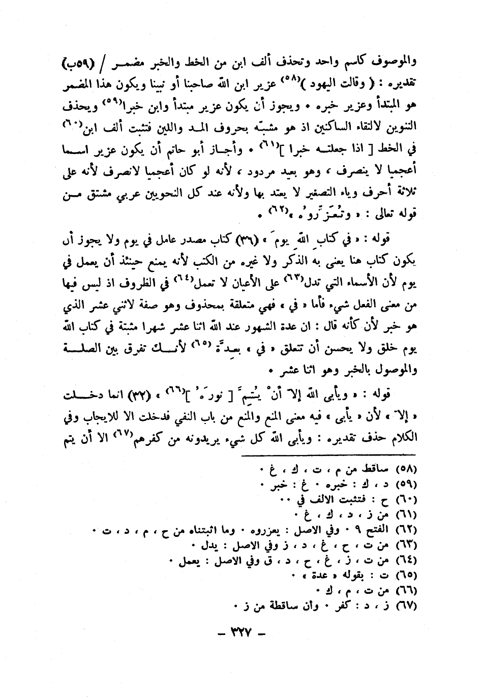 والموصوف كاسم وَاحِد وتحذف ألف ابْن من الْخط وَالْخَبَر مُضْمر تَقْدِيره وَقَالَت الْيَهُود عُزَيْر ابْن الله صاحبنا أَو نَبينَا وَيكون هَذَا الْمُضمر هُوَ الْمُبْتَدَأ وعزير خَبره وَيجوز أَن يكون عُزَيْر مُبْتَدأ وَابْن خَبرا ويحذف التَّنْوِين لالتقاء الساكنين إِذْ هُوَ مشبه بحروف الْمَدّ واللين فَتثبت ألف ابْن فِي الْخط إِذا جعلته خَبرا وَأَجَازَ أَبُو حَاتِم أَن يكون عُزَيْر اسْما أعجميا لَا ينْصَرف وَهُوَ بعيد مَرْدُود لِأَنَّهُ لَو كَانَ أعجميا لأنصرف لِأَنَّهُ على ثَلَاثَة أحرف وياء التصغير لَا يعْتد بهَا وَلِأَنَّهُ عِنْد كل النَّحْوِيين عَرَبِيّ مُشْتَقّ من قَوْله تَعَالَى وتعزروه