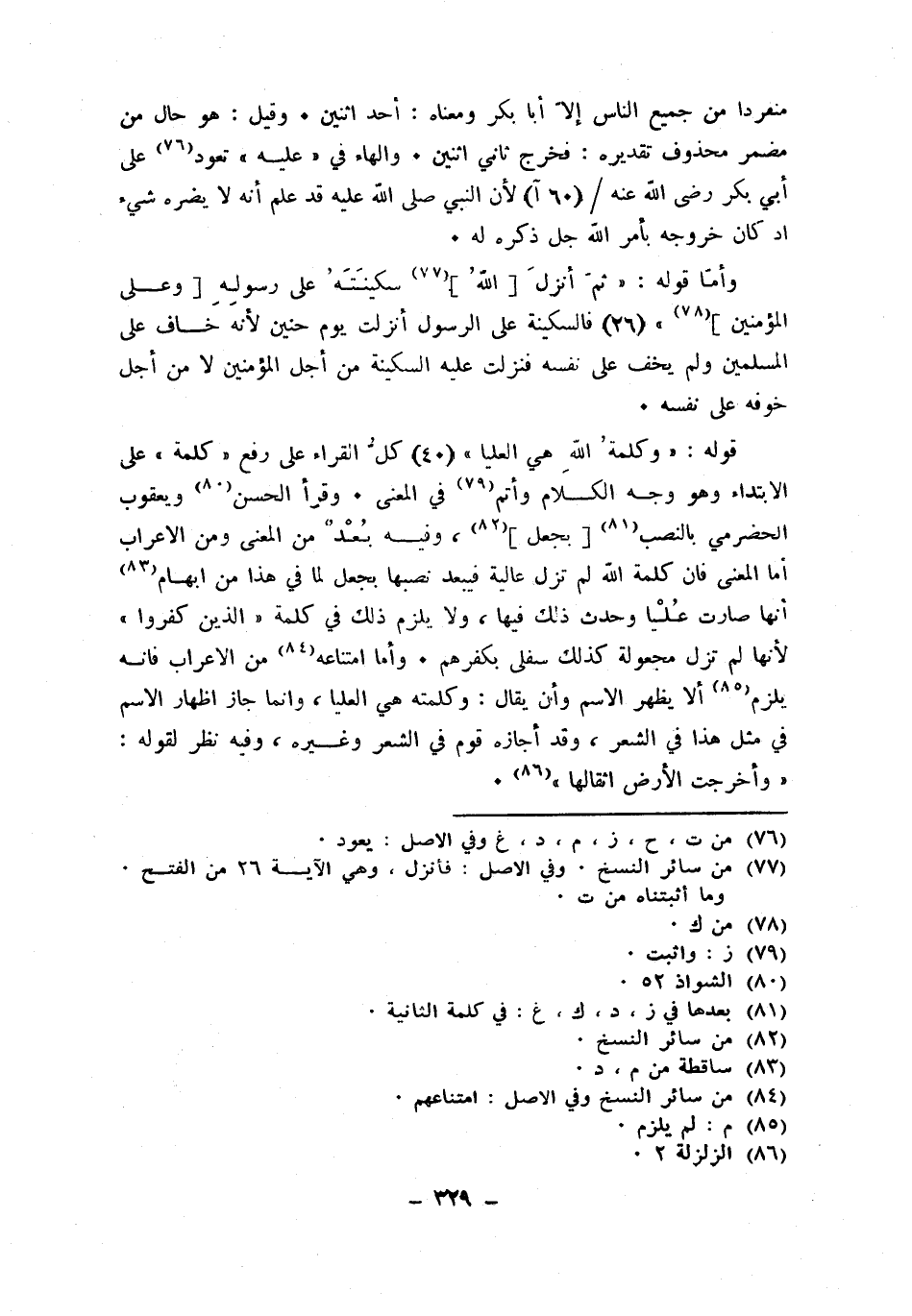 قَوْله {وَكلمَة الله هِيَ الْعليا} كل الْقُرَّاء على رفع كلمة على الِابْتِدَاء وَهُوَ وَجه الْكَلَام وَأتم فِي الْمَعْنى وَقَرَأَ الْحسن وَيَعْقُوب الْحَضْرَمِيّ بِالنّصب بِجعْل وَفِيه بعد من الْمَعْنى وَمن الْإِعْرَاب أما الْمَعْنى فَأن كلمة الله لم تزل عالية فيبعد نصبها بِجعْل لما فِي هَذَا من ابهام أَنَّهَا صَارَت عَلَيْهِ وَحدث ذَلِك فِيهَا وَلَا يلْزم ذَلِك فِي كلمة الَّذين كفرُوا لِأَنَّهَا لم تزل مجعولة كَذَلِك سفلى بكفرهم وَأما امْتِنَاعه من الْإِعْرَاب فَإِنَّهُ يلْزم أَلا يظْهر الِاسْم وَأَن يُقَال وكلمته هِيَ الْعليا وَإِنَّمَا جَازَ إِظْهَار الِاسْم فِي مثل هَذَا فِي الشّعْر وَقد أجَازه قوم فِي الشّعْر وَغَيره وَفِيه نظر لقَوْله وأخرجت الأَرْض أثقالها