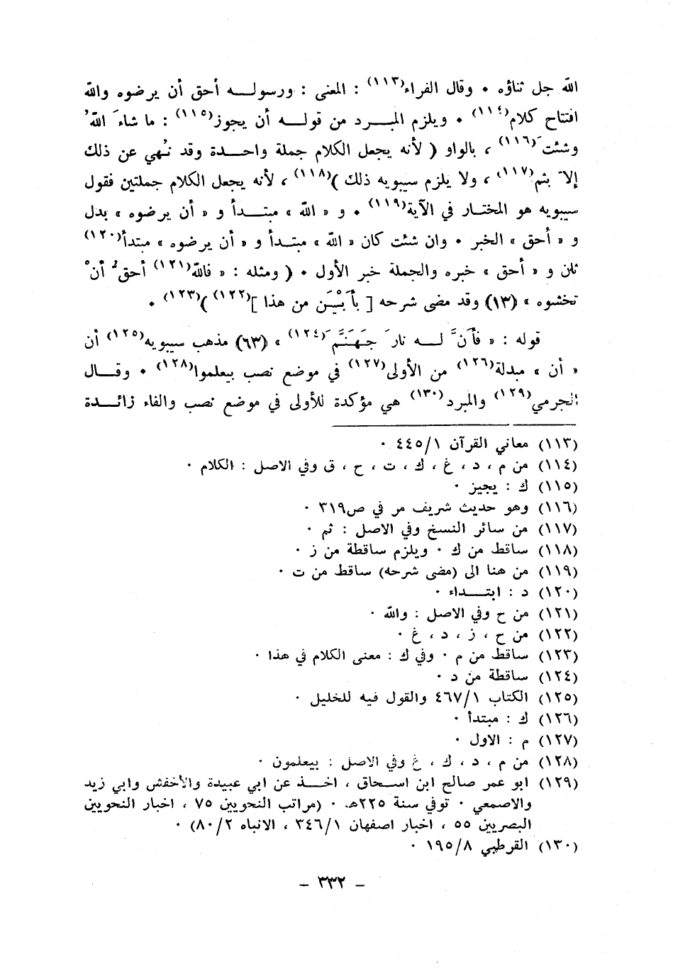 الله جلّ ثَنَاؤُهُ وَقَالَ الْفراء الْمَعْنى وَرَسُوله أَحَق أَن يرضوه وَالله افْتِتَاح كَلَام وَيلْزم الْمبرد من قَوْله أَن يجوز مَا شَاءَ الله وشئت بِالْوَاو لِأَنَّهُ يَجْعَل الْكَلَام جملَة وَاحِدَة وَقد نهي عَن ذَلِك إِلَّا بثم وَلَا يلْزم سِيبَوَيْهٍ ذَلِك لِأَنَّهُ يَجْعَل الْكَلَام جملتين فَقَوْل سِيبَوَيْهٍ هُوَ الْمُخْتَار فِي الْآيَة وَالله مُبْتَدأ وَأَن يرضوه بدل وأحق الْخَبَر وان شِئْت كَانَ الله مُبْتَدأ وان يرضوه مُبْتَدأ ثَان وأحق خَبره وَالْجُمْلَة خبر الأول وَمثله فَالله أَحَق أَن تخشوه وَقد مضى شَرحه بأبين من هَذَا