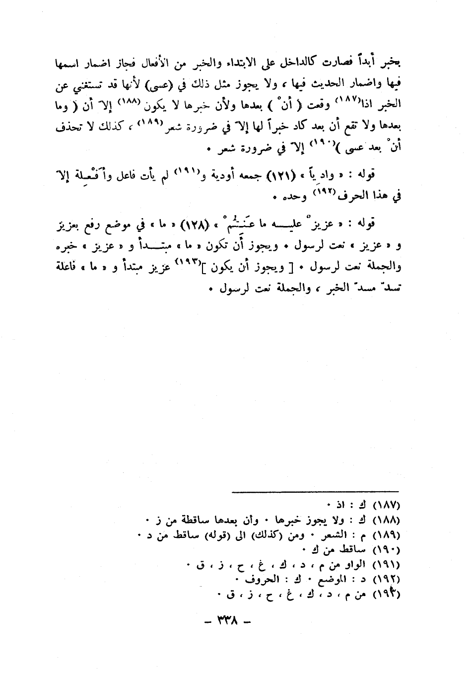 بِخَبَر أبدا فَصَارَت كالداخل على الِابْتِدَاء وَالْخَبَر من الْأَفْعَال فَجَاز إِضْمَار اسْمهَا فِيهَا وإضمار الحَدِيث فِيهَا وَلَا يجوز مثل ذَلِك فِي عَسى لِأَنَّهَا قد تَسْتَغْنِي عَن الْخَبَر إِذا وَقعت أَن بعْدهَا وَلِأَن خَبَرهَا لَا يكون إِلَّا أَن وَمَا بعْدهَا وَلَا تقع أَن بعد كَاد خَبرا لَهَا إِلَّا فِي ضَرُورَة شعر وَكَذَلِكَ لَا تحذف أَن بعد عَسى إِلَّا فِي ضَرُورَة شعر