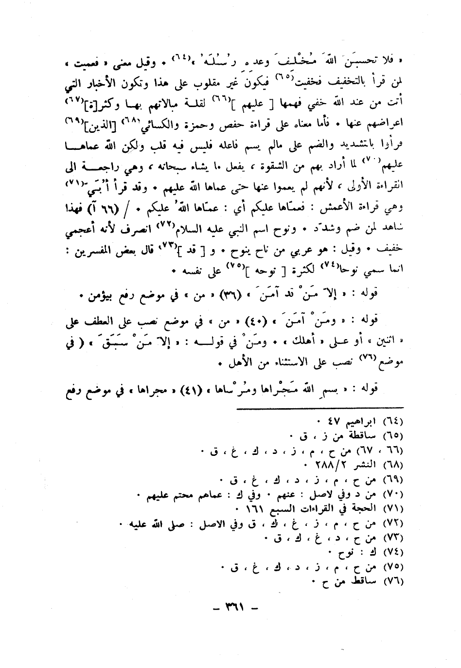 فَلَا تحسبن الله مخلف وعده رسله وَقيل معنى فعميت لمن قَرَأَ بِالتَّخْفِيفِ فخفيت فَيكون غير مقلوب على هَذَا وَتَكون الْأَخْبَار الَّتِي أَتَت من عِنْد الله خَفِي فهمها عَلَيْهِم لقلَّة مبالاتهم بهَا وَكَثْرَة إعراضهم عَنْهَا فَأَما مَعْنَاهُ على قِرَاءَة حَفْص وَحَمْزَة وَالْكسَائِيّ الَّذين قرأوا بِالتَّشْدِيدِ وَالضَّم على مَا لم يسم فَاعله فَلَيْسَ فِيهِ قلب وَلَكِن الله عماها عَلَيْهِم لما أَرَادَ بهم من الشقوة يفعل مَا يَشَاء سُبْحَانَهُ وَهِي رَاجِعَة إِلَى الْقِرَاءَة الأولى لأَنهم لم يعموا عَنْهَا حَتَّى عماها الله عَلَيْهِم وَقد قَرَأَ أبي وَهِي قِرَاءَة الْأَعْمَش فعماها عَلَيْكُم أَي عماها الله عَلَيْكُم فَهَذَا شَاهد لمن ضم وشدد ونوح اسْم النَّبِي عَلَيْهِ السَّلَام انْصَرف لِأَنَّهُ أعجمي خَفِيف وَقيل هُوَ عَرَبِيّ من ناح ينوح وَقد قَالَ بعض الْمُفَسّرين إِنَّمَا سمي نوحًا لِكَثْرَة نوحه على نَفسه