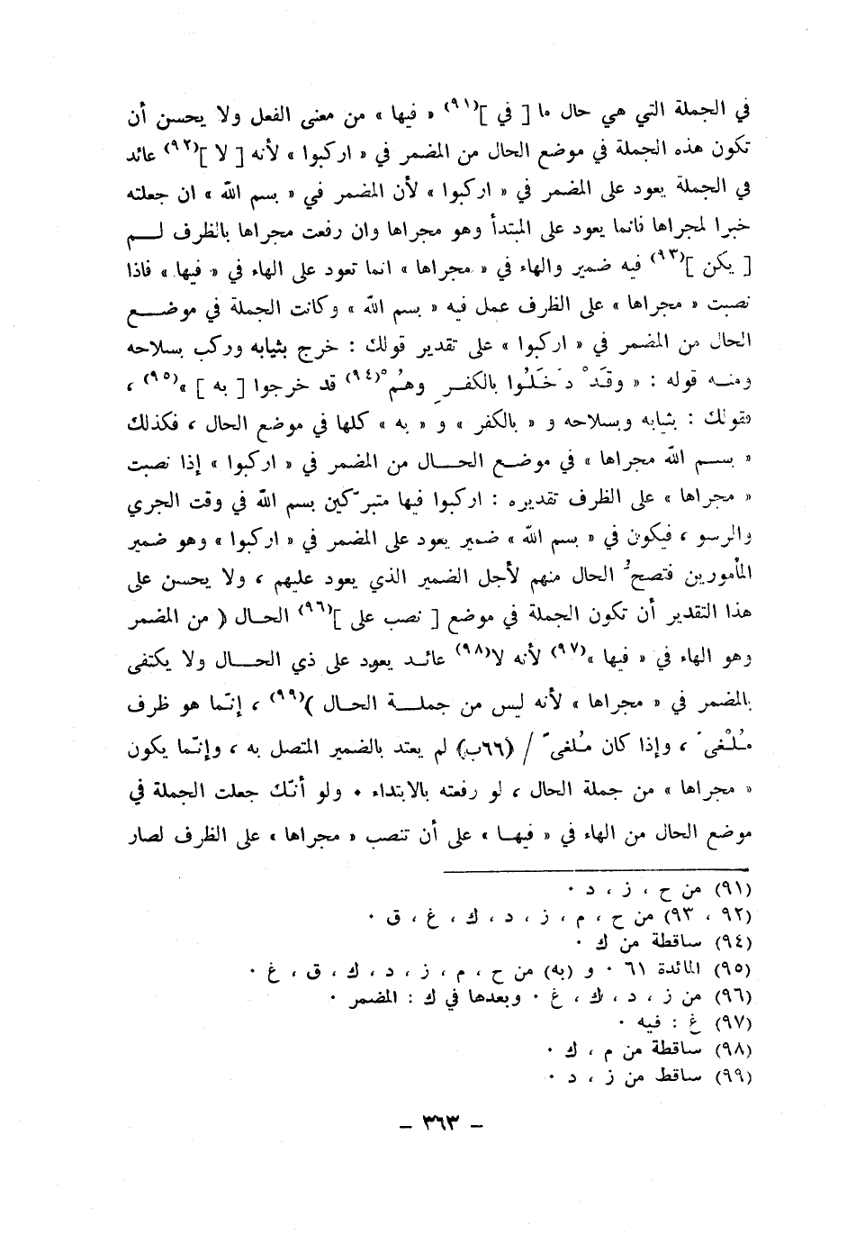 فِي الْجُمْلَة الَّتِي هِيَ حَال مَا فِي فِيهَا من معنى الْفِعْل وَلَا يحسن أَن تكون هَذِه الْجُمْلَة فِي مَوضِع الْحَال من الْمُضمر فِي اركبوا لِأَنَّهُ لَا عَائِد فِي الْجُمْلَة يعود على الْمُضمر فِي اركبوا لِأَن الْمُضمر فِي بِسم الله ان جعلته خَبرا لمجراها فَإِنَّمَا يعود على الْمُبْتَدَأ وَهُوَ مجْراهَا وان رفعت مجْراهَا بالظرف لم يكن فِيهِ ضمير وَالْهَاء فِي مجْراهَا إِنَّمَا تعود على الْهَاء فِي فِيهَا فَإِذا نصبت مجْراهَا على الظّرْف عمل فِيهِ بِسم الله وَكَانَت الْجُمْلَة فِي مَوضِع الْحَال من الْمُضمر فِي اركبوا على تَقْدِير قَوْلك خرج بثيابه وَركب بسلاحه وَمِنْه قَوْله وَقد دخلُوا بالْكفْر وهم قد خَرجُوا بِهِ فقولك بثيابه وبسلاحه بالْكفْر وَبِه كلهَا فِي مَوضِع الْحَال فَكَذَلِك بِسم الله مجْراهَا فِي مَوضِع الْحَال من الْمُضمر فِي اركبوا إِذا نصبت مجْراهَا على الظّرْف تَقْدِيره اركبوا فِيهَا متبركين بِسم الله فِي وَقت الجري والرسو فَيكون فِي بِسم الله ضمير يعود على الْمُضمر فِي اركبوا وَهُوَ ضمير المأمورين فَتَصِح الْحَال مِنْهُم لأجل الضَّمِير الَّذِي يعود عَلَيْهِم وَلَا يحسن على هَذَا التَّقْدِير أَن تكون الْجُمْلَة فِي مَوضِع نصب على الْحَال من الْمُضمر وَهُوَ الْهَاء فِي فِيهَا لِأَنَّهُ لَا عَائِد يعود على ذِي الْحَال وَلَا يَكْتَفِي بالمضمر فِي مجْراهَا لِأَنَّهُ لَيْسَ من جملَة الْحَال إِنَّمَا هُوَ ظرف ملغى وَإِذا كَانَ ملغى لم يعْتد بالضمير الْمُتَّصِل بِهِ وَإِنَّمَا يكون مجْراهَا فِي جملَة الْحَال لَو رفعته بِالِابْتِدَاءِ وَلَو أَنَّك جعلت الْجُمْلَة فِي مَوضِع الْحَال من الْهَاء فِي فِيهَا على أَن تنصب مجْراهَا على الظّرْف لصار