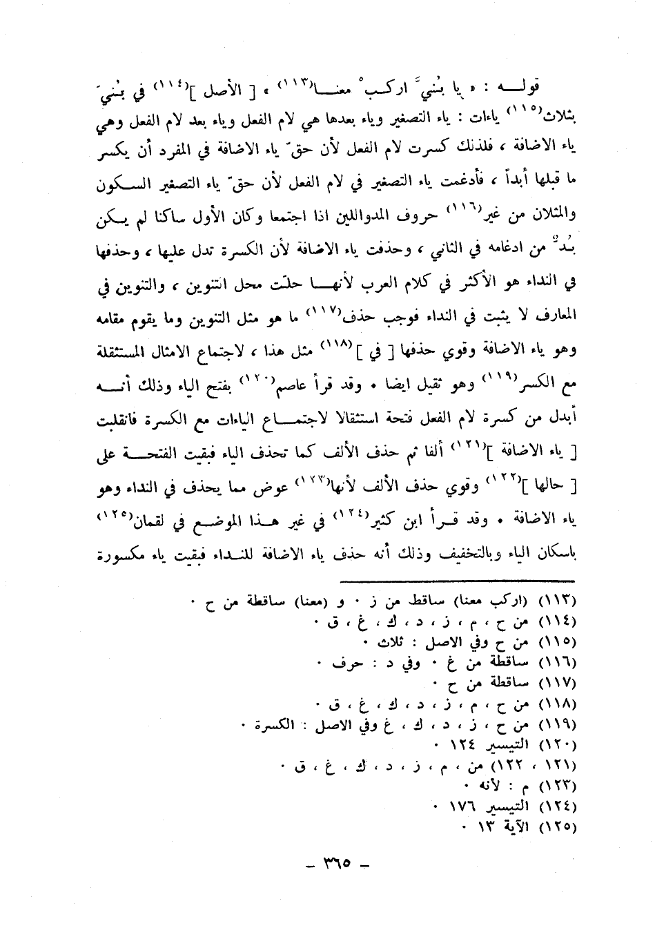 قَوْله {يَا بني اركب مَعنا} الأَصْل فِي بني بِثَلَاث ياءات يَاء التصغير وَيَا بعْدهَا هِيَ لَام الْفِعْل وياء بعد لَام الْفِعْل وَهِي يَاء الْإِضَافَة فَلذَلِك كسرت لَام الْفِعْل لِأَن حق يَاء الْإِضَافَة فِي الْمُفْرد أَن يكسر مَا قبلهَا أبدا فأدغمت يَاء التصغير فِي لَام الْفِعْل لِأَن حق يَاء التصغير السّكُون والمثلان من غير حُرُوف الْمَدّ واللين إِذا اجْتمعَا وَكَانَ الأول سَاكِنا لم يكن بُد من ادغامه فِي الثَّانِي وحذفت يَاء الْإِضَافَة لِأَن الكسرة تدل عَلَيْهَا وحذفها فِي النداء هُوَ الْأَكْثَر فِي كَلَام الْعَرَب لِأَنَّهَا حلت مَحل التَّنْوِين والتنوين فِي المعارف لَا يثبت فِي النداء فَوَجَبَ حذف مَا هُوَ مثل التَّنْوِين وَمَا يقوم مقَامه وَهُوَ يَاء الْإِضَافَة وَقَوي حذفهَا فِي مثل هَذَا لِاجْتِمَاع الْأَمْثَال المستثقلة مَعَ الْكسر وَهُوَ ثقيل أَيْضا وَقد قَرَأَ عَاصِم بِفَتْح الْيَاء وَذَلِكَ أَنه أبدل من كسرة لَام الْفِعْل فَتْحة استثقالا لِاجْتِمَاع الياءات مَعَ الكسرة فَانْقَلَبت يَاء الْإِضَافَة ألفا ثمَّ حذف الْألف كَمَا تحذف الْيَاء فَبَقيت الفتحة على حَالهَا وَقَوي حذف الْألف لِأَنَّهَا عوض مِمَّا يحذف فِي النداء وَهُوَ يَاء الْإِضَافَة وَقد قَرَأَ ابْن كثير فِي غير هَذَا الْموضع فِي لُقْمَان بِإِسْكَان الْيَاء وبالتخفيف وَذَلِكَ أَنه حذف يَاء الْإِضَافَة للنداء فَبَقيت يَاء مَكْسُورَة