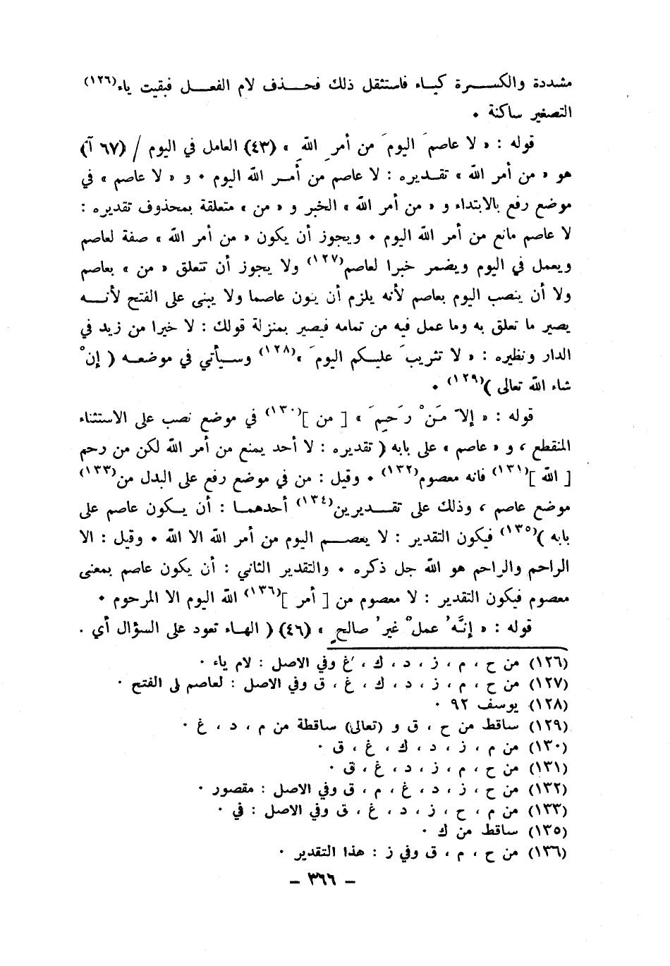قَوْله {لَا عَاصِم الْيَوْم من أَمر الله} الْعَامِل فِي الْيَوْم هُوَ من أَمر الله تَقْدِيره لَا عَاصِم من أَمر الله الْيَوْم وَلَا عَاصِم فِي مَوضِع رفع بِالِابْتِدَاءِ وَمن أَمر الله الْخَبَر وَمن مُتَعَلقَة بِمَحْذُوف تَقْدِيره لَا عَاصِم مَانع من أَمر الله الْيَوْم وَيجوز أَن يكون من أَمر الله صفة لعاصم وَيعْمل فِي الْيَوْم ويضمر خَبرا لعاصم وَلَا يجوز أَن تتَعَلَّق من بعاصم وَلَا أَن ينصب الْيَوْم بعاصم لِأَنَّهُ يلْزم أَن ينون عَاصِمًا وَلَا يَبْنِي على الْفَتْح لِأَنَّهُ يصير مَا تعلق بِهِ وَمَا عمل فِيهِ من تَمَامه فَيصير بِمَنْزِلَة قَوْلك لَا خيرا من زيد فِي الدَّار وَنَظِيره لَا تَثْرِيب عَلَيْكُم الْيَوْم وَسَيَأْتِي فِي مَوْضِعه إِن شَاءَ الله تَعَالَى
