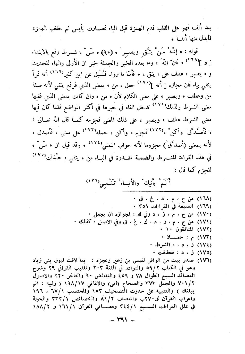 قَوْله {إِنَّه من يتق ويصبر} من شَرط رفع بِالِابْتِدَاءِ وفإن الله وَمَا بعده الْخَبَر وَالْجُمْلَة خبر إِن الأولى وَالْهَاء للْحَدِيث وَيصير عطف على يتق فَأَما مَا رَوَاهُ قنبل عَن ابْن كثير أَنه قَرَأَ يَتَّقِي بياء فان مجازه أَنه جعل من بِمَعْنى الَّذِي فَرفع يَتَّقِي لِأَنَّهُ صلَة لمن وَعطف وَيصير على معنى الْكَلَام لِأَن من وَإِن كَانَت بِمَعْنى الَّذِي فَفِيهَا معنى الشَّرْط وَلذَلِك تدخل الْفَاء فِي خَبَرهَا فِي أَكثر الْمَوَاضِع فَلَمَّا كَانَ فِيهَا معنى الشَّرْط عطف وَيصير على ذَلِك الْمَعْنى فجزمه كَمَا قَالَ الله تَعَالَى فَأَصدق وأكن فَجزم وأكن حمله على معنى فَأَصدق لِأَنَّهُ بِمَعْنى أصدق مَجْزُومًا لِأَنَّهُ جَوَاب التَّمَنِّي وَقد قيل أَن من فِي هَذِه الْقِرَاءَة للشّرط والضمة مقدرَة فِي الْيَاء من يَتَّقِي حذفت للجزم كَمَا قَالَ ... ألم يَأْتِيك والأنباء تنمي ...