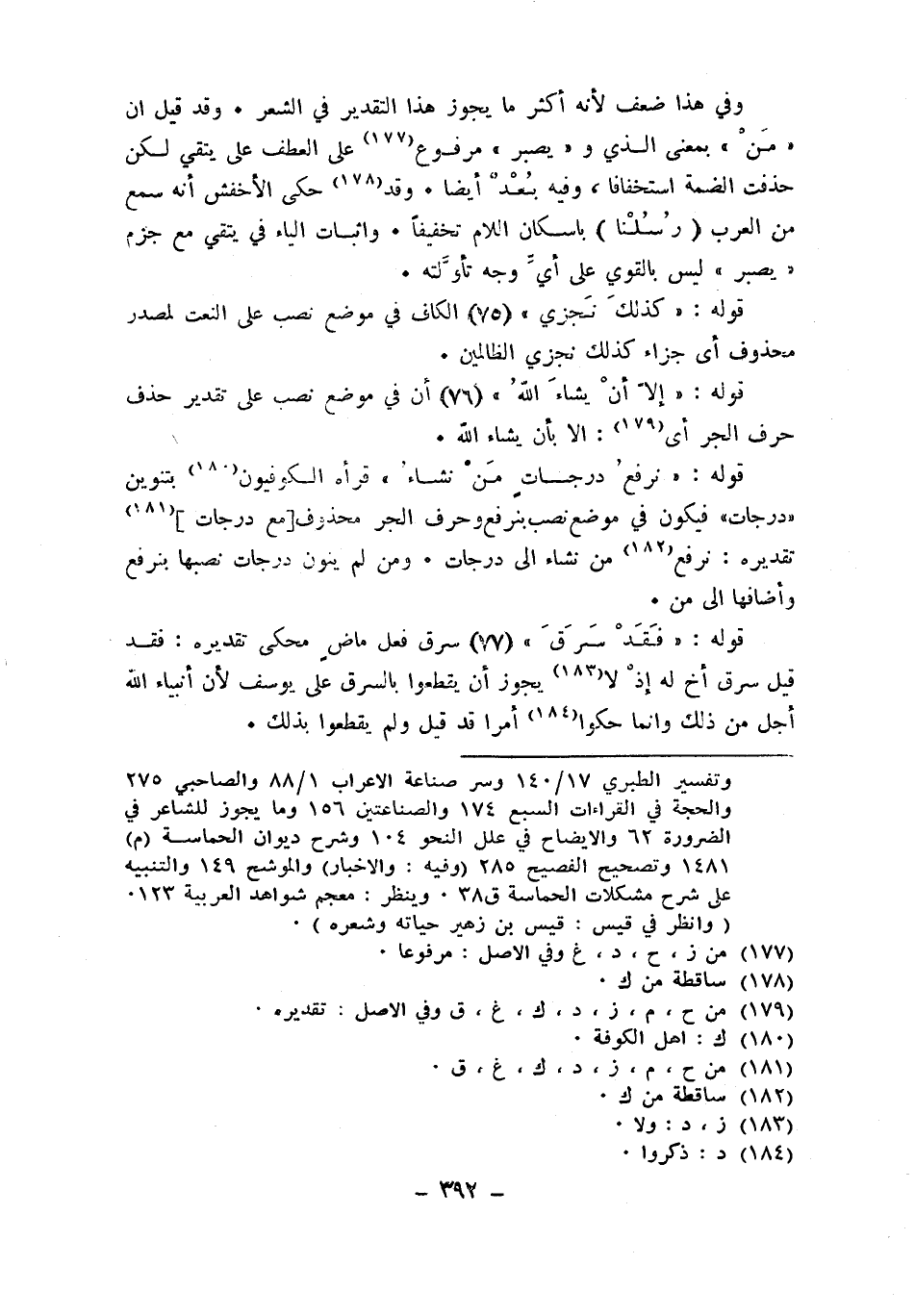 قَوْله {نرفع دَرَجَات من نشَاء} قَرَأَهُ الْكُوفِيُّونَ بتنوين دَرَجَات فَيكون فِي مَوضِع نصب بنرفع وحرف الْجَرّ مَحْذُوف مَعَ دَرَجَات تَقْدِيره نرفع من نشَاء إِلَى دَرَجَات وَمن لم ينون دَرَجَات نصبها بنرفع وأضافها إِلَى من