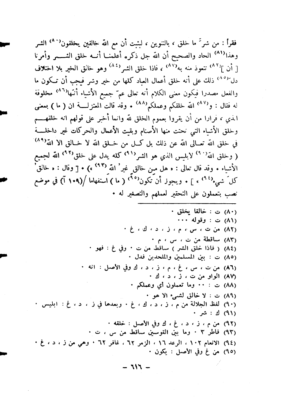 فَقَرَأَ من شَرّ مَا خلق بِالتَّنْوِينِ ليثبت أَن مَعَ الله خالقين يخلقون الشَّرّ وَهَذَا الحاد وَالصَّحِيح أَن الله جلّ ذكره أعلمنَا أَنه خلق الشَّرّ وأمرنا أَن نتعوذ مِنْهُ بِهِ فاذا خلق الشَّرّ وَهُوَ خَالق الْخَيْر بِلَا اخْتِلَاف دلّ ذَلِك على أَنه خلق أَعمال الْعباد كلهَا من خير وَشر فَيجب أَن تكون مَا وَالْفِعْل مصدرا فَيكون معنى الْكَلَام أَنه تَعَالَى عَم جَمِيع الْأَشْيَاء أَنَّهَا مخلوقة لَهُ فَقَالَ وَالله خَلقكُم وعملكم وَقد قَالَت الْمُعْتَزلَة ان مَا بِمَعْنى الَّذِي قرارا من أَن يقرُّوا بِعُمُوم الْخلق لله وانما اخبر على قَوْلهم انه خلقهمْ وَخلق الْأَشْيَاء الَّتِي نحتت مِنْهَا الْأَصْنَام وَبقيت الْأَعْمَال والحركات غير دَاخِلَة فِي خلق الله تَعَالَى الله عَن ذَلِك بل كل من خلق الله لَا خَالق الا الله وَخلق الله لابليس الَّذِي هُوَ الشَّرّ كُله يدل على خلق الله لجَمِيع الْأَشْيَاء وَقد قَالَ تَعَالَى هَل من خَالق غير الله وَقَالَ خَالق كل شَيْء وَيجوز أَن تكون مَا استفهاما فِي مَوضِع نصب بتعملون على التحقير لعملهم والتصغير لَهُ
