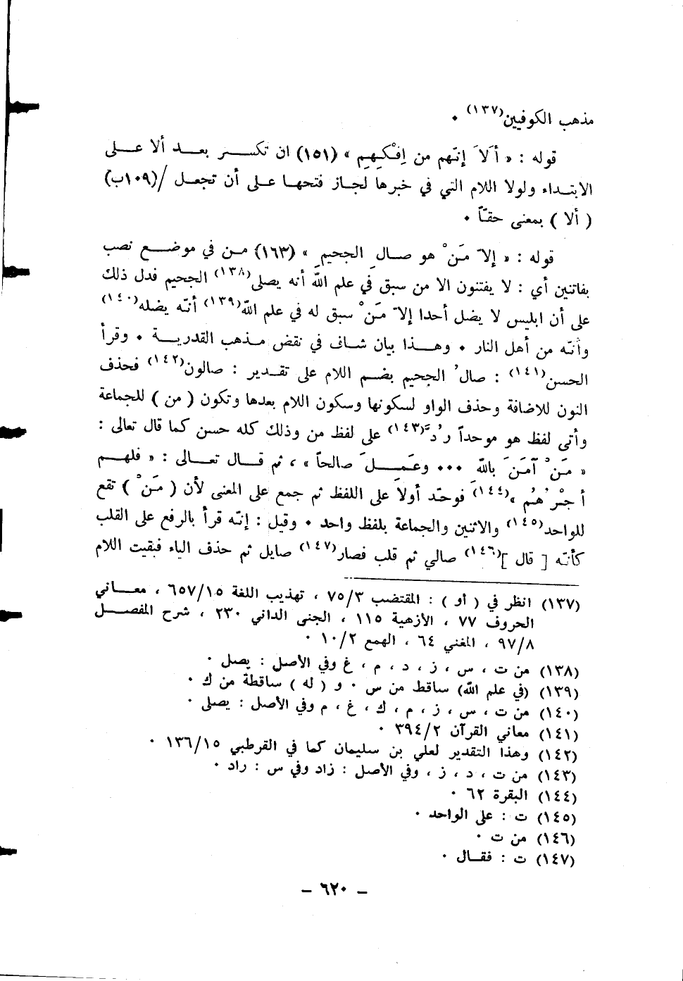 قَوْله {إِلَّا من هُوَ صال الْجَحِيم} من فِي مَوضِع نصب بفاتنين أَي لَا يفتنون الا من سبق فِي علم الله أَنه يصلى الْجَحِيم فَدلَّ ذَلِك على أَن ابليس لَا يضل أحدا إِلَّا من سبق لَهُ فِي علم الله أَنه يضله وَأَنه من أهل النَّار وَهَذَا بَيَان شاف فِي نقض مَذْهَب الْقَدَرِيَّة وَقَرَأَ الْحسن صال الْجَحِيم بِضَم اللَّام على تَقْدِير صالون فَحذف النُّون للاضافة وَحذف الْوَاو لسكونها وَسُكُون اللَّام بعْدهَا وَتَكون من للْجَمَاعَة وأتى لفظ هُوَ موحدا رد على لفظ من وَذَلِكَ كُله حسن كَمَا قَالَ تَعَالَى {من آمن بِاللَّه وَالْيَوْم الآخر وَعمل صَالحا} ثمَّ قَالَ تَعَالَى {فَلهم أجرهم} فَوحد أَولا على اللَّفْظ ثمَّ جمع على الْمَعْنى لِأَن من تقع للْوَاحِد والاثنين وَالْجَمَاعَة بِلَفْظ وَاحِد وَقيل إِنَّه قَرَأَ بِالرَّفْع على الْقلب كَأَنَّهُ قَالَ صالي ثمَّ قلب فَصَارَ صايل ثمَّ حذف الْيَاء فَبَقيت اللَّام
