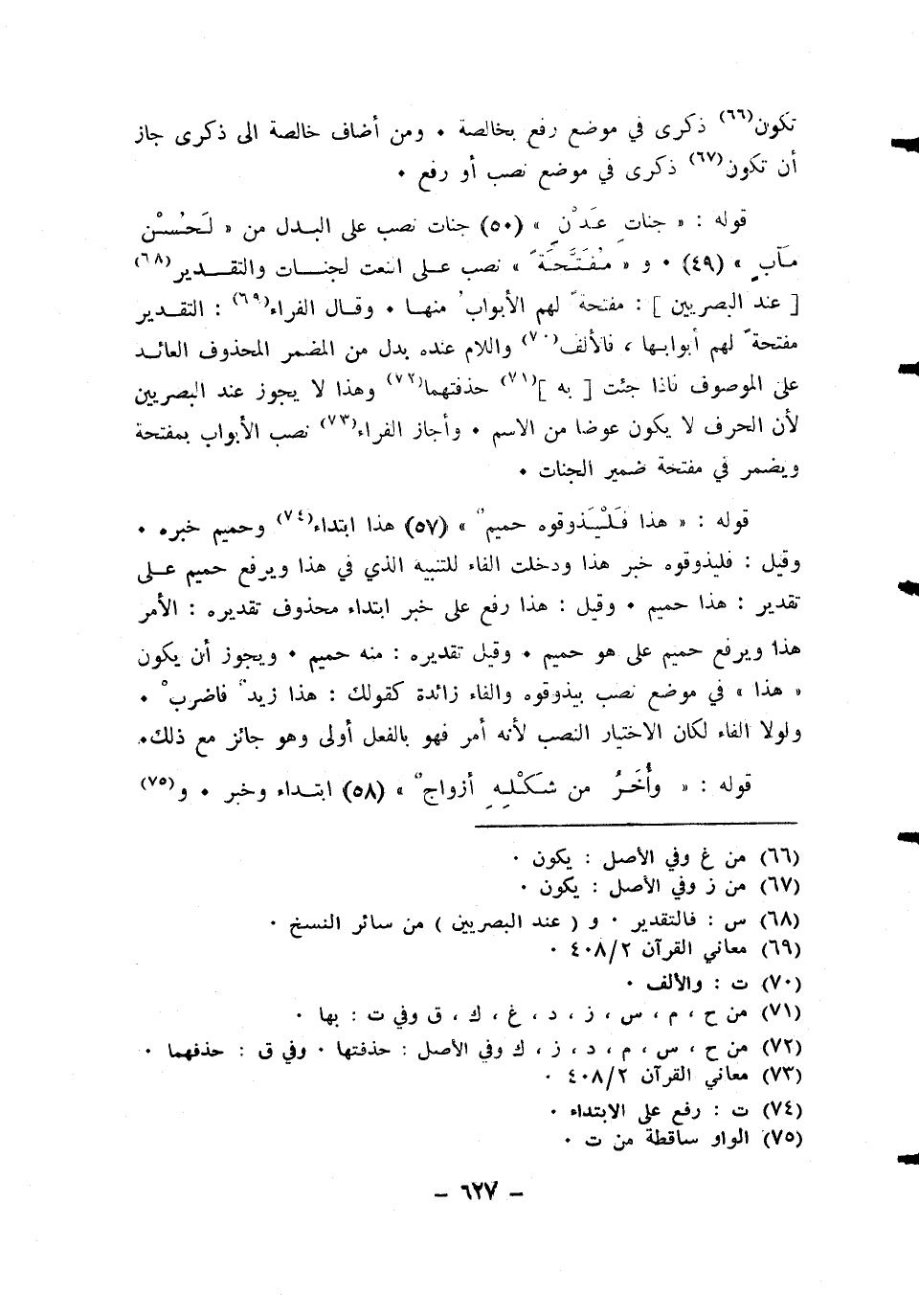 قَوْله {جنَّات عدن} جنَّات نصب على الْبَدَل من لحسن ماب ومفتحة نصب على النَّعْت لجنات وَالتَّقْدِير عِنْد الْبَصرِيين مفتحة لَهُم الْأَبْوَاب مِنْهَا وَقَالَ الْفراء التَّقْدِير مفتحة لَهُم أَبْوَابهَا فالألف وَاللَّام عِنْده بدل من الْمُضمر الْمَحْذُوف الْعَائِد على الْمَوْصُوف فاذا جِئْت بِهِ حذفتهما وَهَذَا لَا يجوز عِنْد الْبَصرِيين لِأَن الْحَرْف لَا يكون عوضا من الِاسْم وَأَجَازَ الْفراء نصب الْأَبْوَاب بمفتحة ويضمر فِي مفتحة ضمير الجنات