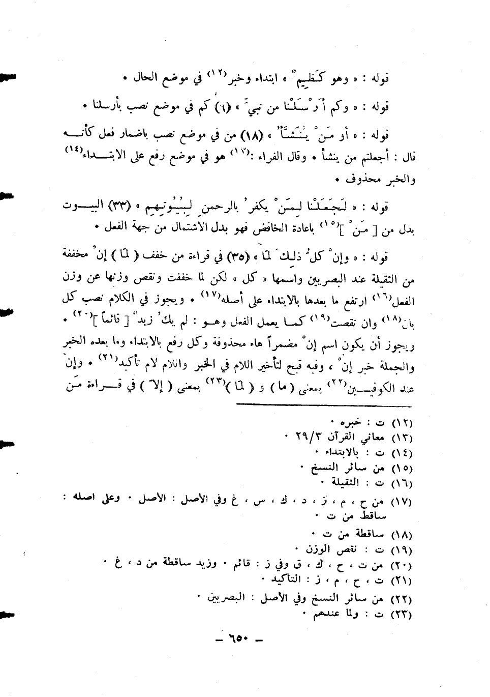 قَوْله {وَإِن كل ذَلِك لما} فِي قِرَاءَة من خفف إِن مُخَفّفَة من الثَّقِيلَة عِنْد الْبَصرِيين وَاسْمهَا كل لَكِن لما خففت وَنقص وَزنهَا عَن وزن الْفِعْل ارْتَفع مَا بعْدهَا بِالِابْتِدَاءِ على اصلة وَيجوز فِي الْكَلَام نصب كل بَان وان نقصت كَمَا يعْمل الْفِعْل وَهُوَ لم يَك زيد قَائِما وَيجوز أَن يكون اسْم إِن مضمرا هَاء محذوفة وكل رفع بِالِابْتِدَاءِ وَمَا بعده الْخَبَر وَالْجُمْلَة خبر إِن وَفِيه قبح لتأخير اللَّام فِي الْخَبَر وَاللَّام لَام تَأْكِيد وَإِن عِنْد الْكُوفِيّين بِمَعْنى مَا وَلما بِمَعْنى إِلَّا فِي قِرَاءَة من