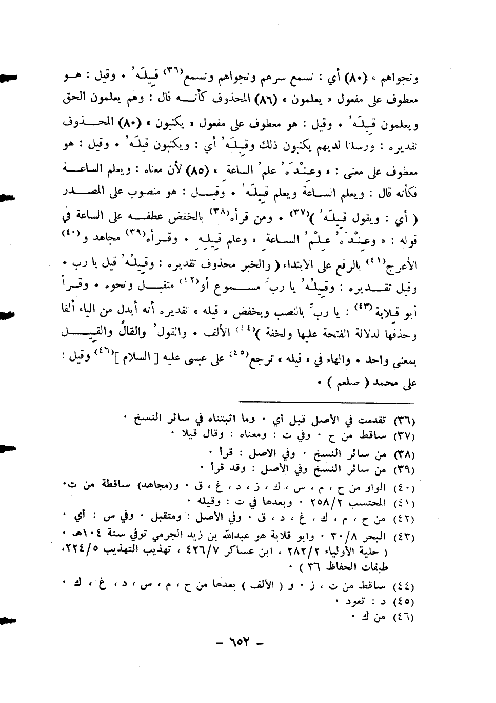 أَي نسْمع سرهم ونجواهم ونسمع قيله وَقيل هُوَ مَعْطُوف على مفعول يعلمُونَ الْمَحْذُوف كَأَنَّهُ قَالَ وهم يعلمُونَ الْحق ويعلمون قيله وَقيل هُوَ مَعْطُوف على مفعول يَكْتُبُونَ الْمَحْذُوف تَقْدِيره وَرُسُلنَا لديهم يَكْتُبُونَ ذَلِك وقيله أَي يَكْتُبُونَ قيله وَقيل هُوَ مَعْطُوف على معنى وَعِنْده علم السَّاعَة لِأَن مَعْنَاهُ وَيعلم السَّاعَة فَكَأَنَّهُ قَالَ وَيعلم السَّاعَة وَيعلم قيله وَقيل هُوَ مَنْصُوب على الْمصدر أَي وَيَقُول قيله وَمن قَرَأَهُ بالخفض عطفه على السَّاعَة فِي قَوْله وَعِنْده علم السَّاعَة وَعلم قيله وقرأه مُجَاهِد والأعرج بِالرَّفْع على الِابْتِدَاء وَالْخَبَر مَحْذُوف تَقْدِيره وقيله قيل يَا رب وَقيل تَقْدِيره وقيله يَا رب مسموع أَو متقبل وَنَحْوه وَقَرَأَ أَبُو قلَابَة يَا رب بِالنّصب وبخفض قيله تَقْدِيره أَنه أبدل من الْيَاء ألفا وحذفها لدلَالَة الفتحة عَلَيْهَا ولخفة الْألف وَالْقَوْل والقال والقيل بِمَعْنى وَاحِد وَالْهَاء فِي قيله ترجع على عِيسَى عَلَيْهِ السَّلَام وَقيل على مُحَمَّد عَلَيْهِ الصَّلَاة وَالسَّلَام
