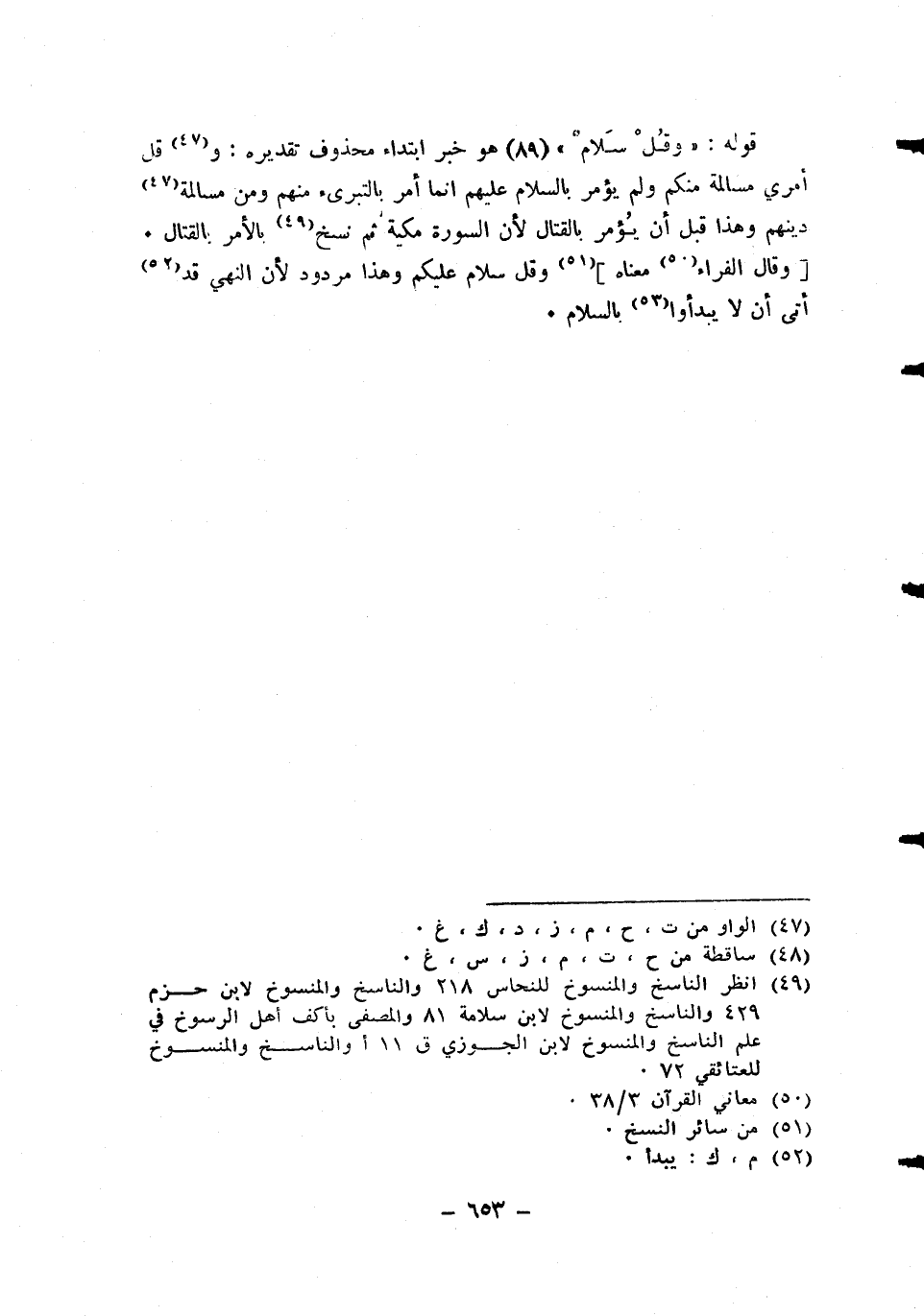 وقولة {وَقل سَلام} هُوَ خبر ابْتِدَاء مَحْذُوف تَقْدِيره وَقل أَمْرِي مسالمة مِنْكُم وَلم يُؤمر بِالسَّلَامِ عَلَيْهِم انما أَمر بالتبرىء مِنْهُم وَمن مسالمة دينهم وَهَذَا قبل أَن يُؤمر بِالْقِتَالِ لِأَن السُّورَة مَكِّيَّة ثمَّ نسخ بِالْأَمر بِالْقِتَالِ وَقَالَ الْفراء مَعْنَاهُ وَقل سَلام عَلَيْكُم وَهَذَا مَرْدُود لِأَن النَّهْي قد أَتَى أَن لَا يبدأوا بِالسَّلَامِ