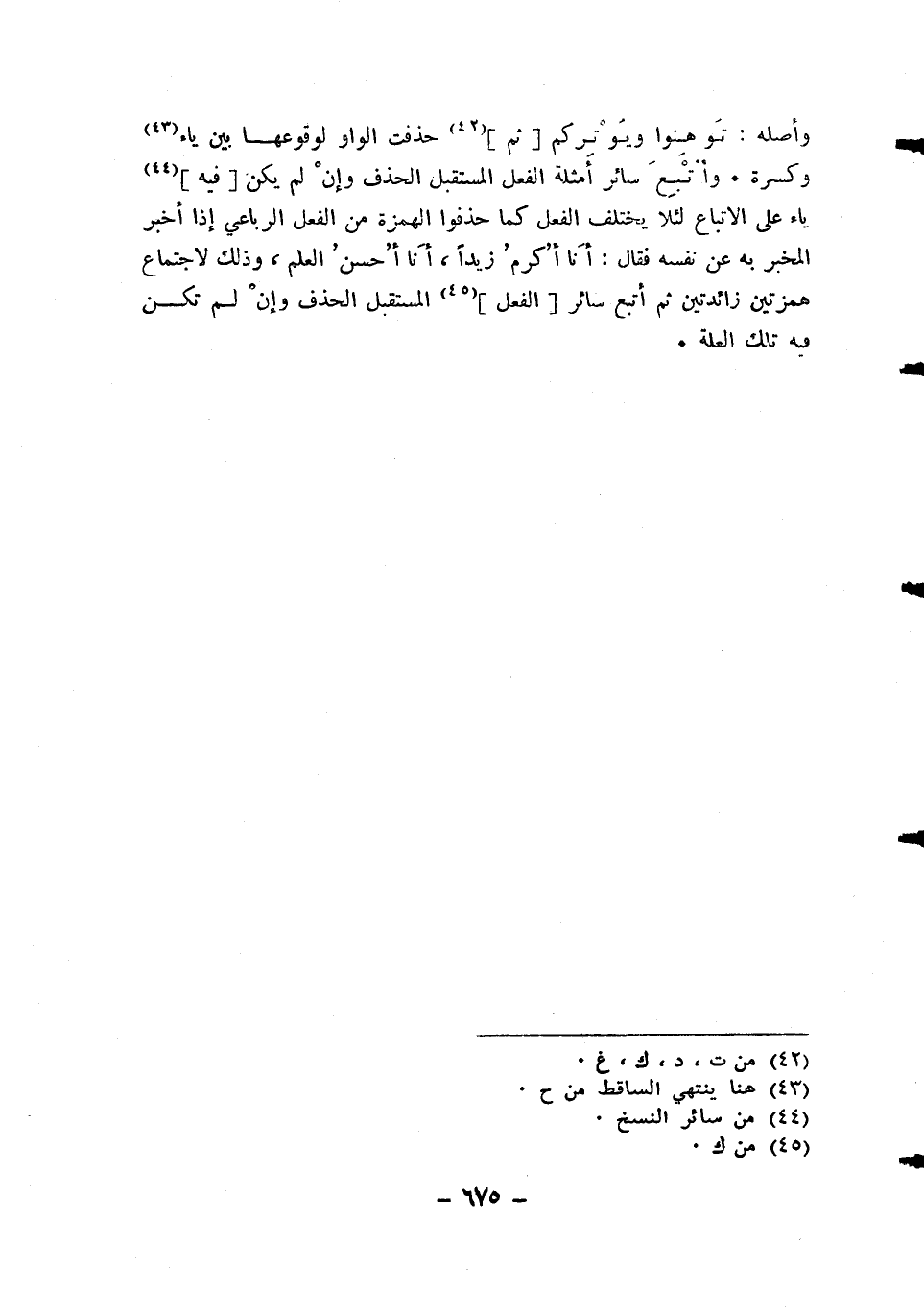 وَأَصله توهنوا ويوتركم ثمَّ حذفت الْوَاو لوقوعها بَين يَاء وكسرة وأتبع سَائِر أَمْثِلَة الْفِعْل الْمُسْتَقْبل الْحَذف وَإِن لم يكن فِيهِ يَاء على الِاتِّبَاع لِئَلَّا يخْتَلف الْفِعْل كَمَا حذفوا الْهمزَة من الْفِعْل الرباعي إِذا أخبر الْمخبر بِهِ عَن نَفسه فَقَالَ أَنا أكْرم زيدا أَنا أحسن الْعلم وَذَلِكَ لِاجْتِمَاع همزتين زائدتين ثمَّ أتبع سَائِر الْفِعْل الْمُسْتَقْبل الْحَذف وَإِن لم تكن فِيهِ تِلْكَ الْعلَّة