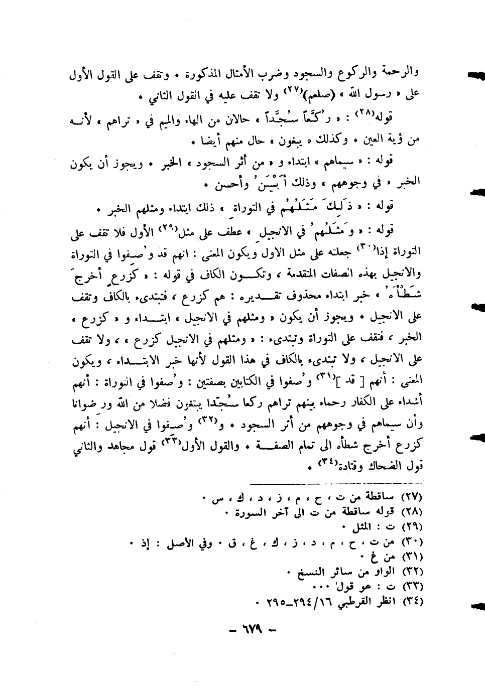 قَوْله {وَمثلهمْ فِي الْإِنْجِيل} عطف على مثل الأول فَلَا تقف على التَّوْرَاة إِذا جعلته على مثل الاول وَيكون الْمَعْنى انهم قد وصفوا فِي التَّوْرَاة والانجيل بِهَذِهِ الصِّفَات الْمُتَقَدّمَة وَتَكون الْكَاف فِي قَوْله كزرع أخرج شطأه خبر ابْتِدَاء مَحْذُوف تَقْدِيره هم كزرع فتبتدىء بِالْكَاف وتقف على الانجيل وَيجوز أَن يكون {وَمثلهمْ فِي الْإِنْجِيل} ابْتِدَاء وكزرع الْخَبَر فتقف على التَّوْرَاة وتبتدىء وَمثلهمْ فِي الانجيل كزرع ولاتقف على الانجيل وَلَا تبتدىء بِالْكَاف فِي هَذَا القَوْل لِأَنَّهَا خبر الِابْتِدَاء وَيكون الْمَعْنى أَنهم قد وصفوا فِي الْكِتَابَيْنِ بصفتين وصفوا فِي التَّوْرَاة أَنهم أشداء على الْكفَّار رحماء بَينهم تراهم ركعا سجدا يَبْتَغُونَ فضلا من الله ورضوانا وَأَن سِيمَاهُمْ فِي وُجُوههم من أثر السُّجُود ووصفوا فِي الانجيل أَنهم كزرع أخرج شطأه الى تَمام الصّفة وَالْقَوْل الأول قَول مُجَاهِد وَالثَّانِي قَول الضَّحَّاك وَقَتَادَة