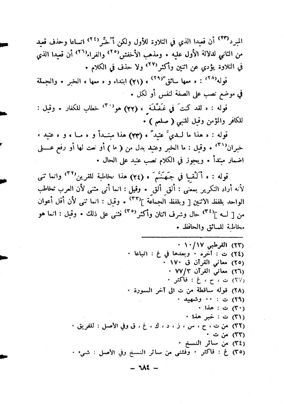 قَوْله ألقيا فِي جَهَنَّم هَذَا مُخَاطبَة للقرين وانما ثنى لِأَنَّهُ أَرَادَ التكرير بِمَعْنى ألق ألق وَقيل انما أَتَى مثنى لِأَن الْعَرَب تخاطب الْوَاحِد بِلَفْظ الِاثْنَيْنِ وبلفظ الْجَمَاعَة وَقيل انما ثنى لِأَن أقل أعوان من لَهُ حَال وَشرف اثْنَان وَأكْثر فَثنى على ذَلِك وَقيل انما هُوَ مُخَاطبَة للسائق والحافظ