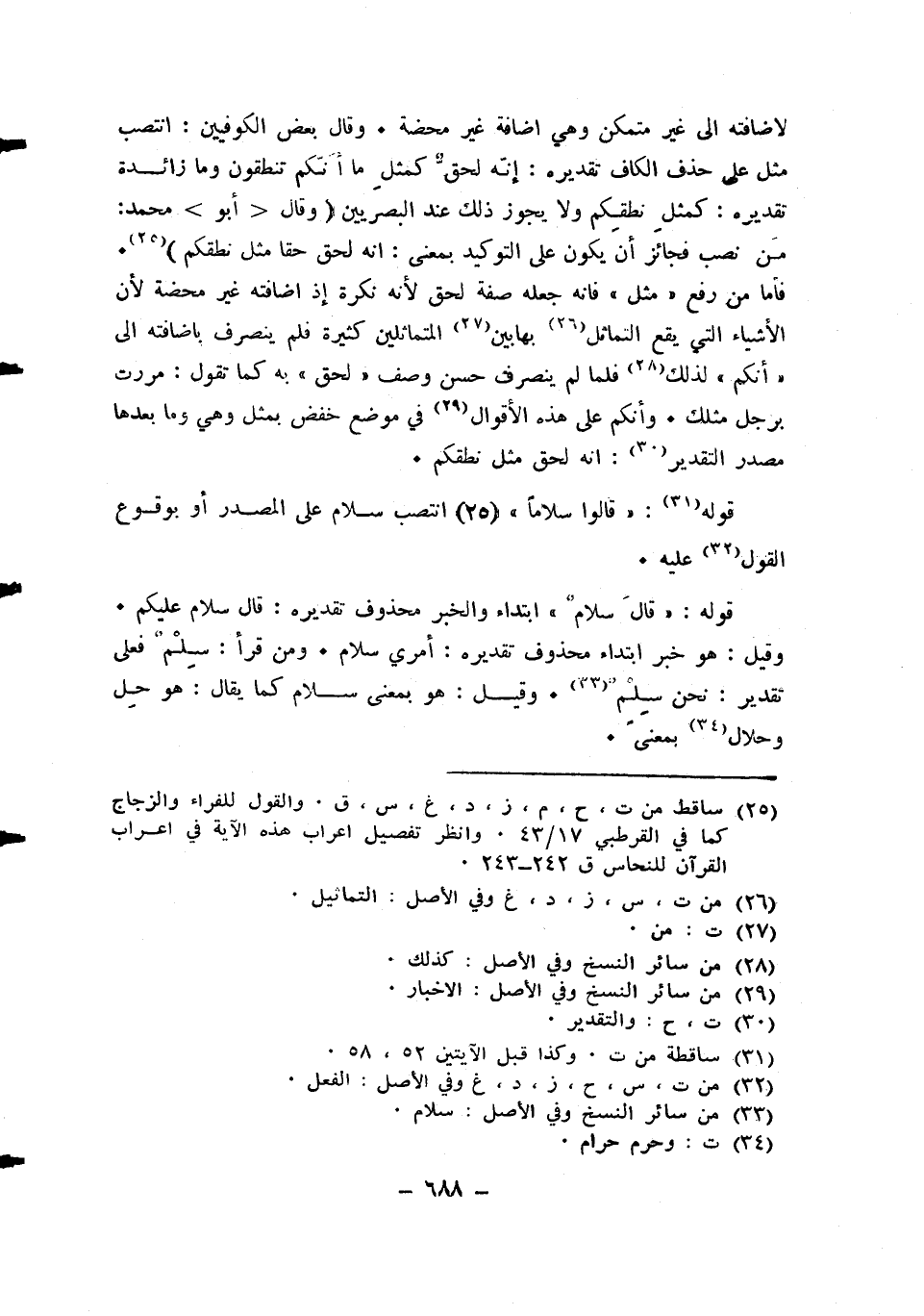 لاضافة الى غير مُتَمَكن وَهِي اضافة غير مَحْضَة وَقَالَ بعض الْكُوفِيّين انتصب مثل على حذف الْكَاف تَقْدِيره إِنَّه لحق كَمثل مَا أَنكُمْ تنطقون وَمَا زَائِدَة تَقْدِيره كَمثل نطقكم وَلَا يجوز ذَلِك عِنْد الْبَصرِيين وَقَالَ أَبُو مُحَمَّد من نصب فَجَائِز أَن يكون على التوكيد بِمَعْنى انه لحق حَقًا مثل نطقكم فَأَما من رفع مثل فانه جعله صفة لحق لِأَنَّهُ نكرَة إِذْ اضافته غير مَحْضَة لِأَن الْأَشْيَاء الَّتِي يَقع التَّمَاثُل بهابين المتما ثلين كَثِيرَة فَلم ينْصَرف باضافته الى أَنكُمْ لذَلِك فَلَمَّا لم ينْصَرف حسن وصف لحق بِهِ كَمَا تَقول مَرَرْت بِرَجُل مثلك وأنكم على هَذِه الْأَقْوَال فِي مَوضِع خفض بِمثل وَهِي وَمَا بعْدهَا مصدر التَّقْدِير انه لحق مثل نطقكم