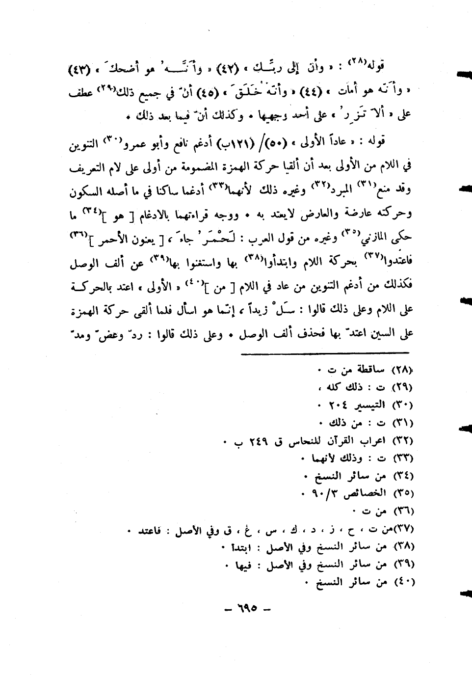 قَوْله عادا الأولى أدغم نَافِع وَأَبُو عَمْرو التَّنْوِين فِي اللَّام من الأولى بعد أَن ألقيا حَرَكَة الْهمزَة المضمومة من أولى على لَام التَّعْرِيف وَقد منع الْمبرد وَغَيره ذَلِك لِأَنَّهُمَا أدغما سَاكِنا فِي مَا أصلة السّكُون وحركته عارضة والعارض لَا يعْتد بِهِ وَوجه قراءتهما بالادغام هُوَ حكى الْمَازِني وَغَيره من قَول الْعَرَب لحمر جَاءَ يعنون الْأَحْمَر فاعتدوا بحركة اللَّام وابتدأوا بهَا واستغنوا بهَا عَن ألف الْوَصْل فَكَذَلِك من أدغم التَّنْوِين من عَاد فِي اللَّام من الأولى اعْتد بالحركة على اللَّام وعَلى ذَلِك قَالُوا سل زيدا إِنَّمَا هُوَ اسْأَل فَلَمَّا ألْقى حَرَكَة الْهمزَة على السِّين اعْتد بهَا فَحذف ألف الْوَصْل وعَلى ذَلِك قَالُوا رد وعض وَمد
