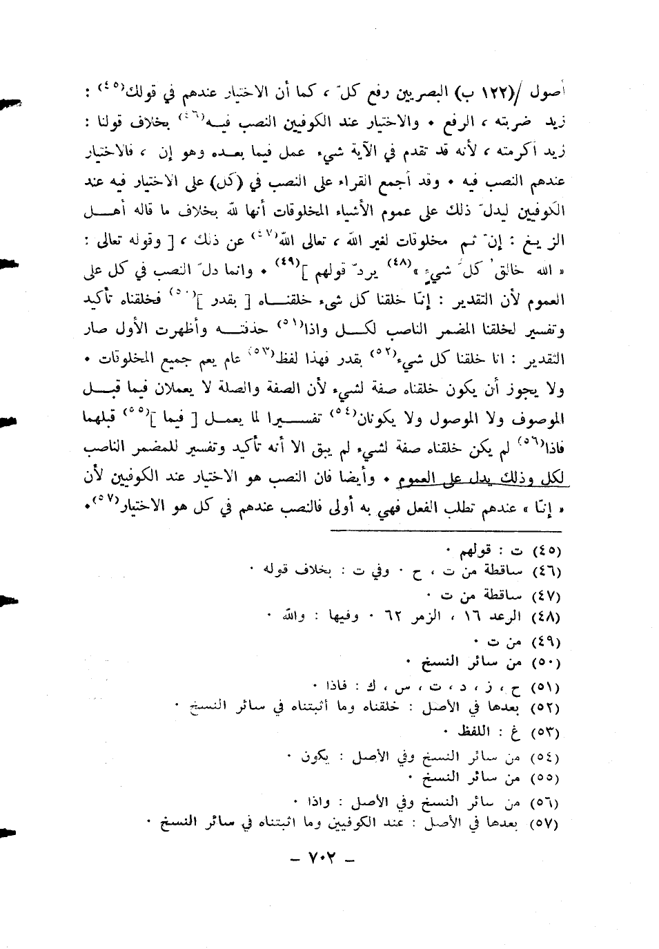 أصُول الْبَصرِيين رفع كل كَمَا أَن الِاخْتِيَار عِنْدهم فِي قَوْلك زيد ضَربته الرّفْع وَالِاخْتِيَار عِنْد الْكُوفِيّين النصب فِيهِ بِخِلَاف قَوْلنَا زيد أكرمته لِأَنَّهُ قد تقدم فِي الاية شَيْء عمل فِيمَا بعده وَهُوَ إِن فالاختيار عِنْدهم النصب فِيهِ وَقد اجْمَعْ الْقُرَّاء على النصب فِي كل على الِاخْتِيَار فِيهِ عِنْد الْكُوفِيّين ليدل ذَلِك على عُمُوم الْأَشْيَاء الْمَخْلُوقَات أَنَّهَا لله لخلاف مَا قَالَه أهل الزيغ إِن ثمَّ مخلوقات لغير الله تَعَالَى الله عَن ذَلِك وَقَوله تَعَالَى الله خَالق كل شَيْء يرد قَوْلهم وانما دلّ النصب فِي كل على الْعُمُوم لِأَن التَّقْدِير إِنَّا خلقنَا كل شىء خلقناه بِقدر فخلقناه تَأْكِيد وَتَفْسِير لخلقنا الْمُضمر الناصب لكل واذا خذفته واظهرت الأول صَار التقديرانا خلقنَا كل شَيْء بِقدر فَهَذَا لفظ عَام يعم جَمِيع الْمَخْلُوقَات وَلَا يجوز أَن يكون خلقناه صفة لشَيْء لِأَن الصّفة والصلة لَا يعملان فِيمَا قبل الْمَوْصُوف وَلَا الْمَوْصُول وَلَا يكونَانِ تَفْسِير لما يعْمل فِيمَا قبلهمَا فاذا لم يكن خلقناه صفة لشَيْء لم يبْق الا أَنه تَأْكِيد وَتَفْسِير للمضمر الناصب لكل وَذَلِكَ يدل على الْعُمُوم وَأَيْضًا فان النصب هُوَ الِاخْتِيَار عِنْد الْكُوفِيّين لِأَن إِنَّا عِنْدهم تطلب الْفِعْل فَهِيَ بِهِ أولى فالنصب عِنْدهم فِي كل هُوَ الِاخْتِيَار