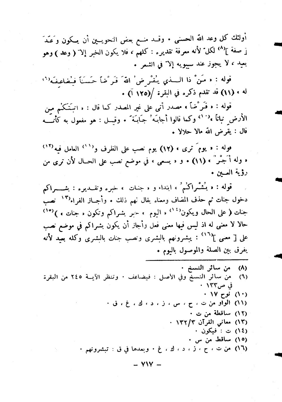 قَوْله بشراكم ابْتِدَاء وجنات خَبره وَتَقْدِيره بشراكم دُخُول جنَّات ثمَّ حذف الْمُضَاف وَمَعْنَاهُ يُقَال لَهُم ذَلِك وَأَجَازَ الْفراء نصب جنَّات على الْحَال وَيكون الْيَوْم خبر بشراكم وَتَكون جنَّات حَالا لَا معنى لَهُ اذ لَيْسَ فِيهَا معنى فعل وَأَجَازَ أَن يكون بشراكم فِي مَوضِع نصب على معنى يبشرونهم بالبشرى وَنصب جنَّات بالبشرى وَكله بعيد لِأَنَّهُ يفرق بَين الصِّلَة والموصول بِالْيَوْمِ